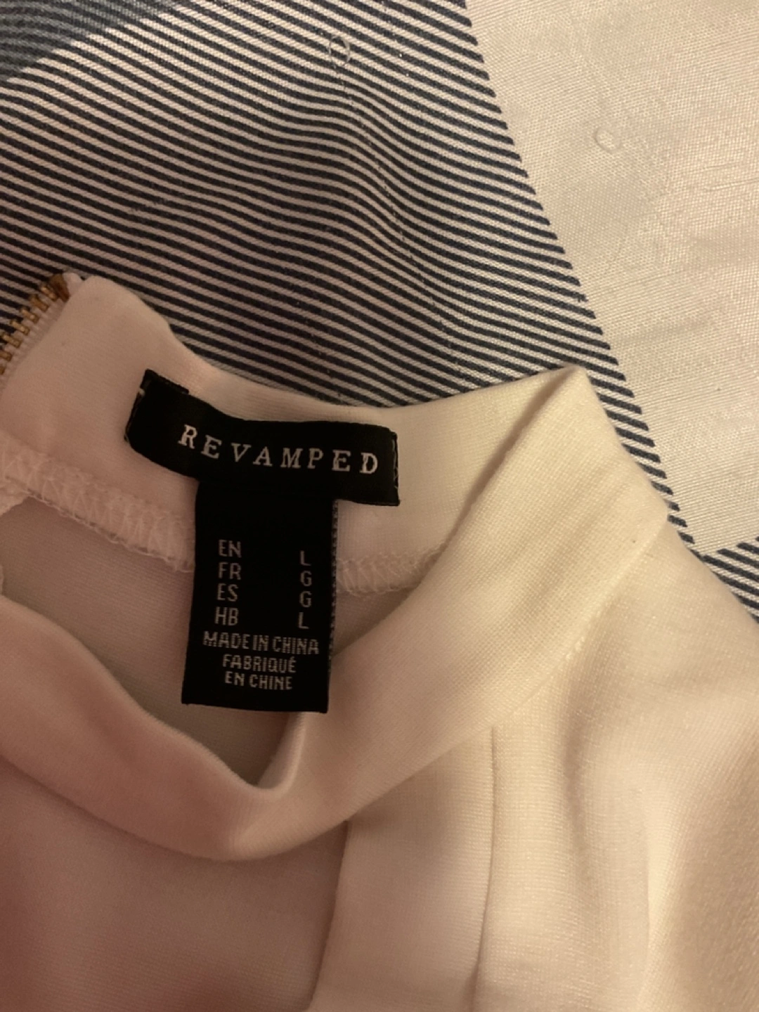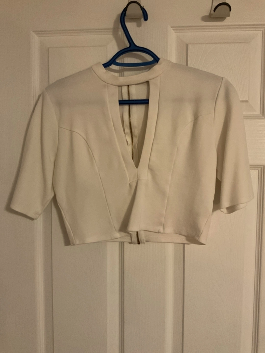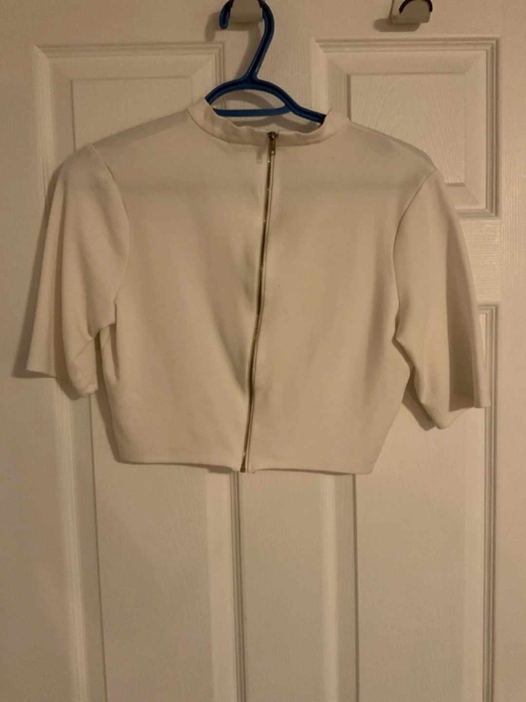 White crop top. Half sleeves. Keyhole neckline. Back zipper. Size large. Made in China. 60% Rayon, 30% Nylon and 4% Spandex. Style #AL08-168