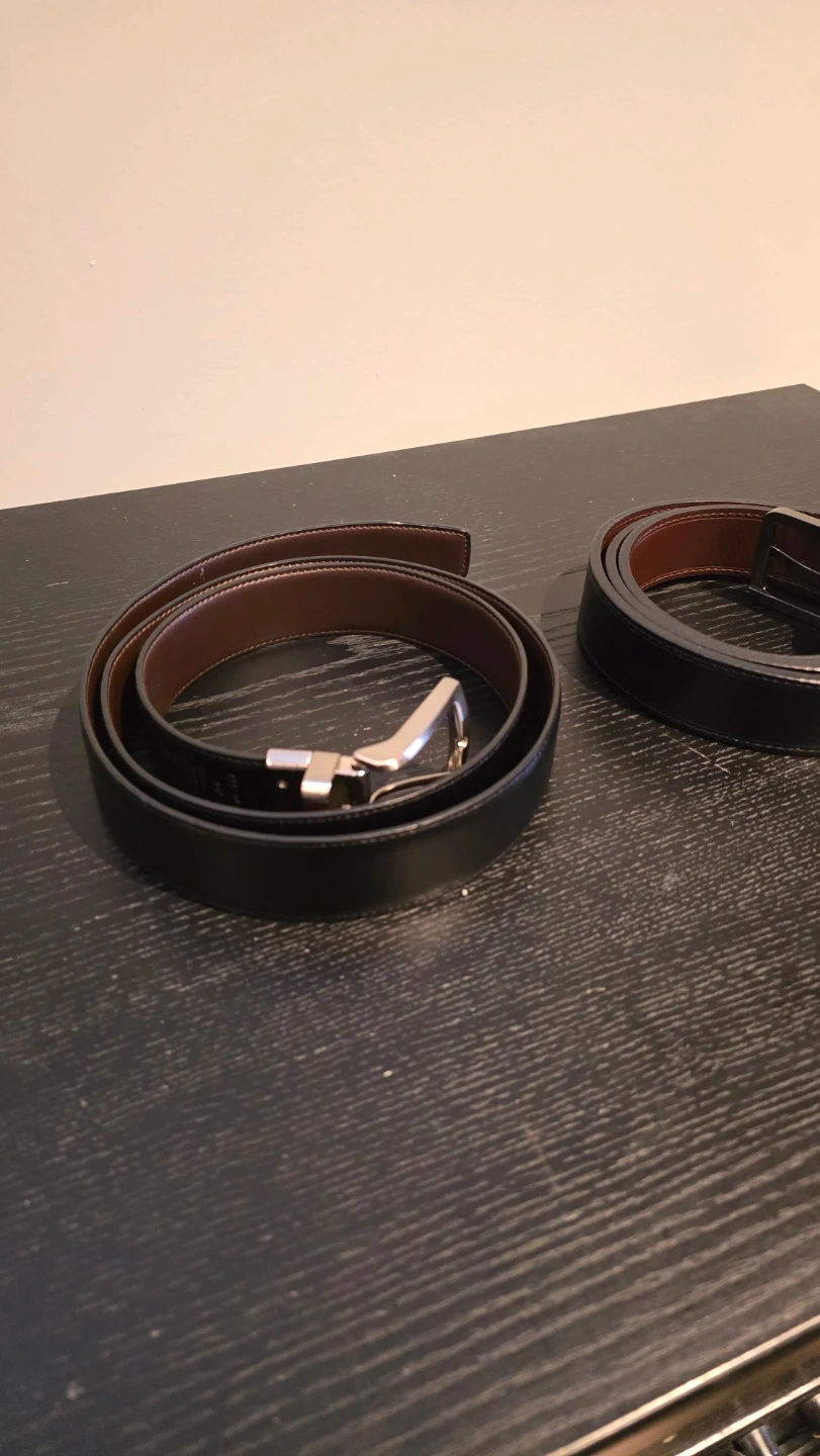 60Selling Two reversible leather belts that fit pant sizes 40 or 42. One side is black, and the other is brown, making it versatile for different outfits. The belt is in great condition and ready for a new home