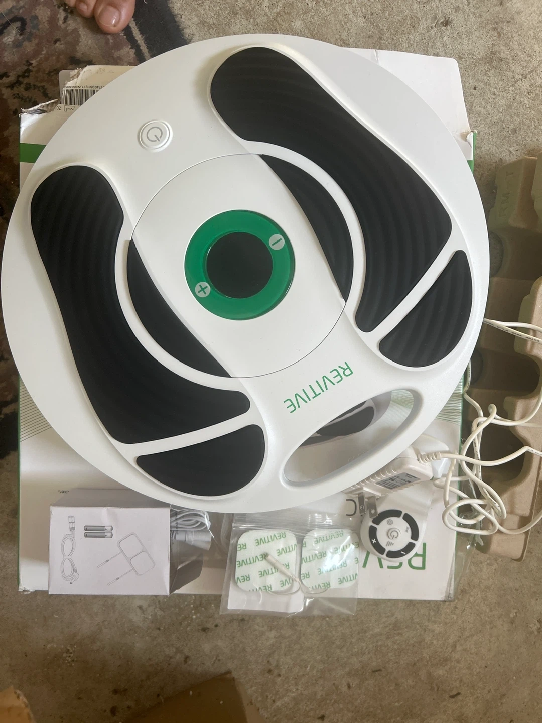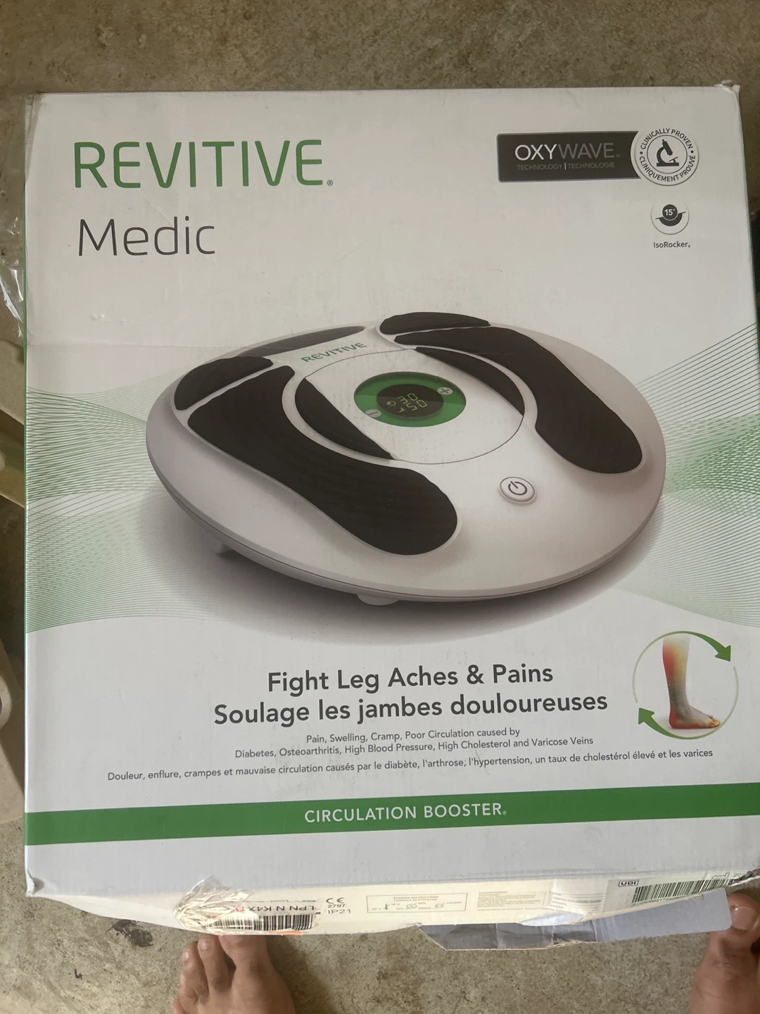 Selling a Revitive Medic Circulation Booster in great condition! It helps fight leg aches and pains, and is clinically proven to improve circulation. Comes with the box and all included components, including the charger and electrode pads. It's designed to help with pain, swelling, cramp, poor circulation, high blood pressure, high cholesterol, and varicose veins. A great circulation booster! Just bought it , just used for a day