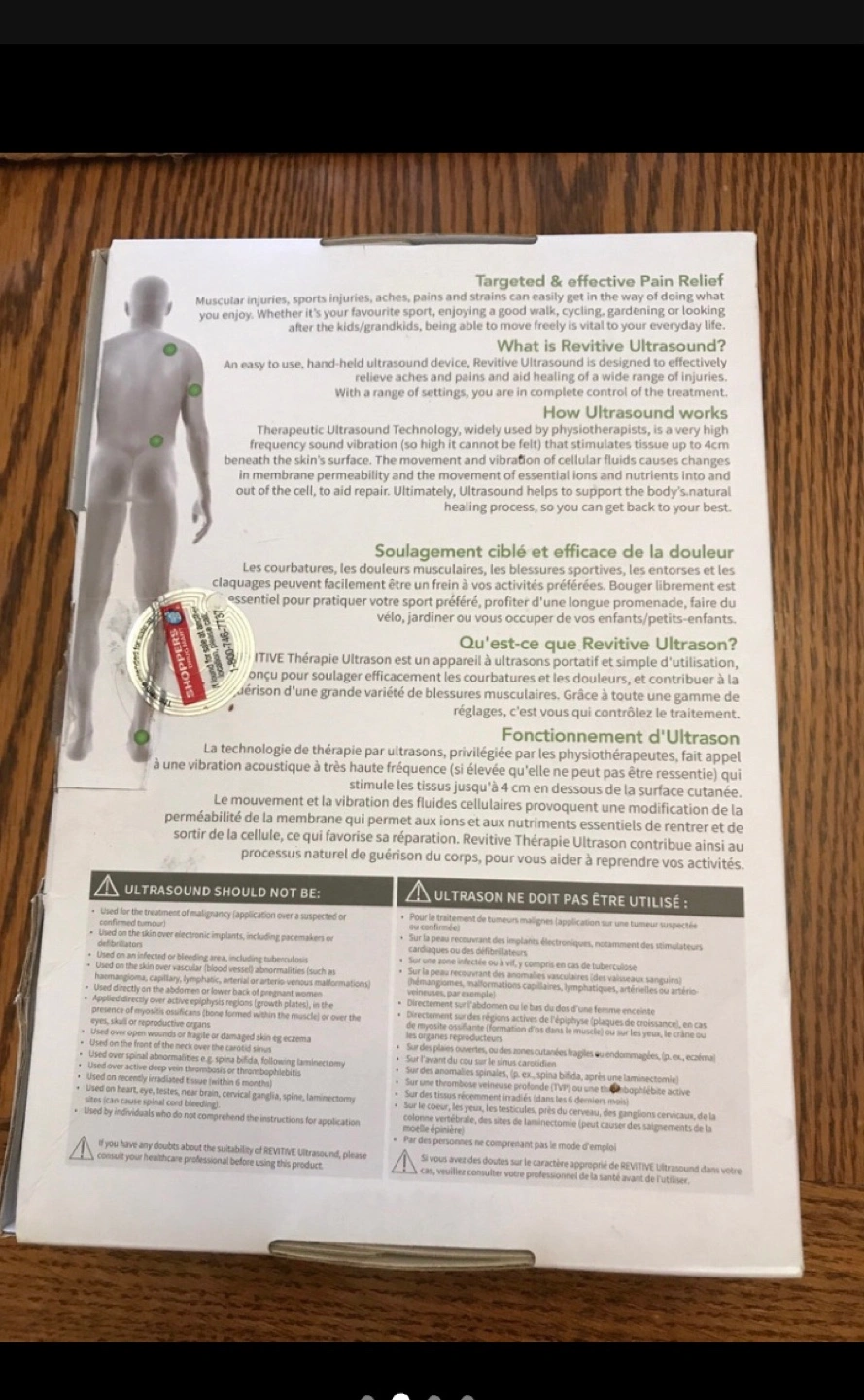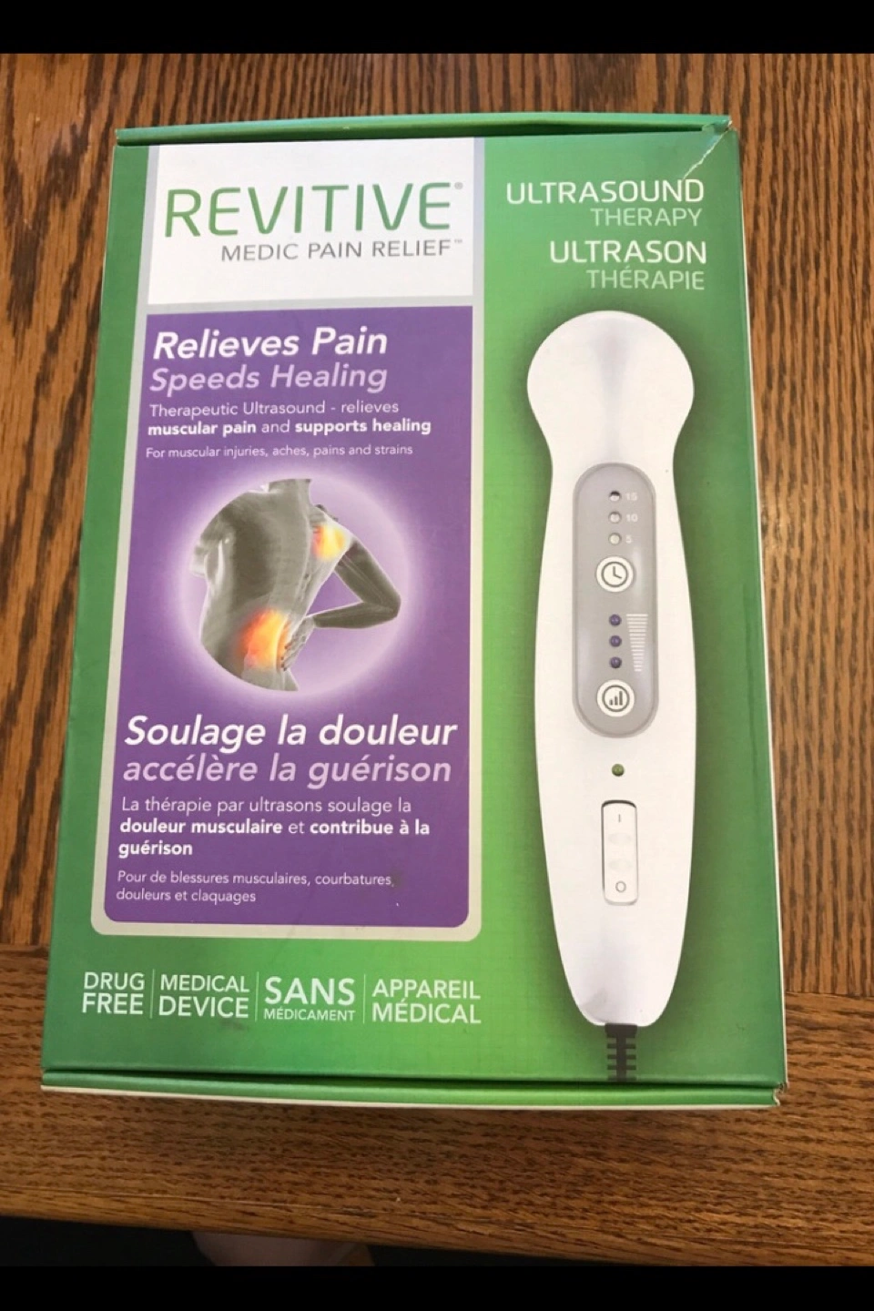 Selling a Revitive Medic Pain Relief Ultrasound Therapy device. It comes with the ultrasound gel and the user's manual. The device is designed to relieve pain and speed up healing for muscular injuries, aches, pains, and strains. It's drug and medical device free!
