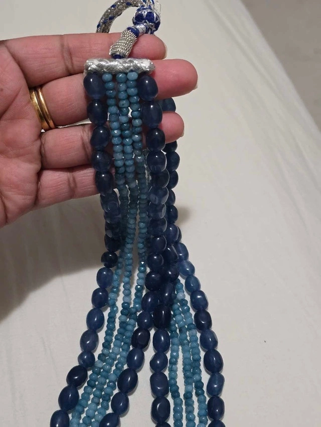 This stunning beaded necklace features multiple strands in shades of blue, creating a beautiful layered look. It's a used item that has been well-maintained and is ready to add a pop of colour to your wardrobe. I am pricing it at $35 CAD. Similar necklaces are typically listed on Kijiji for between $30 and $40, so this is a fair price. If the ad is still up, the item is still available.
