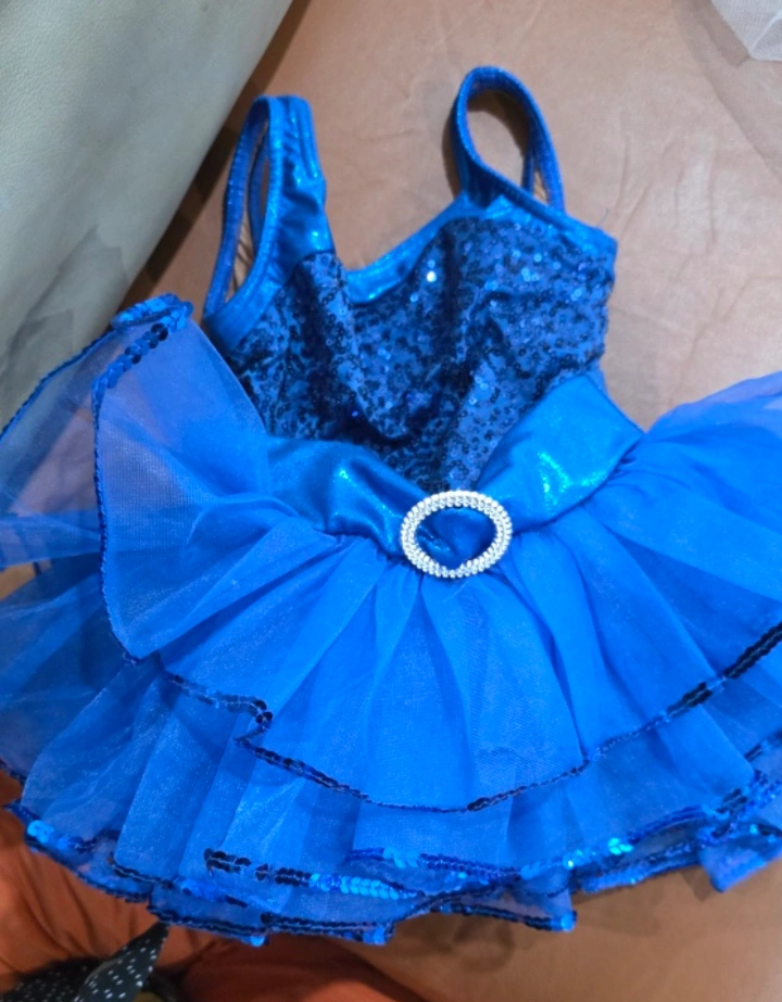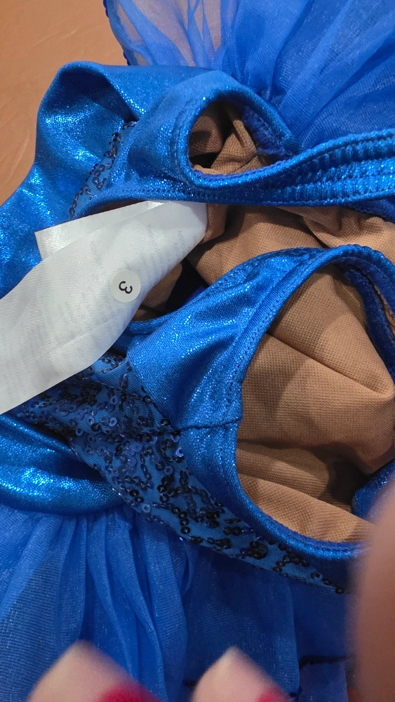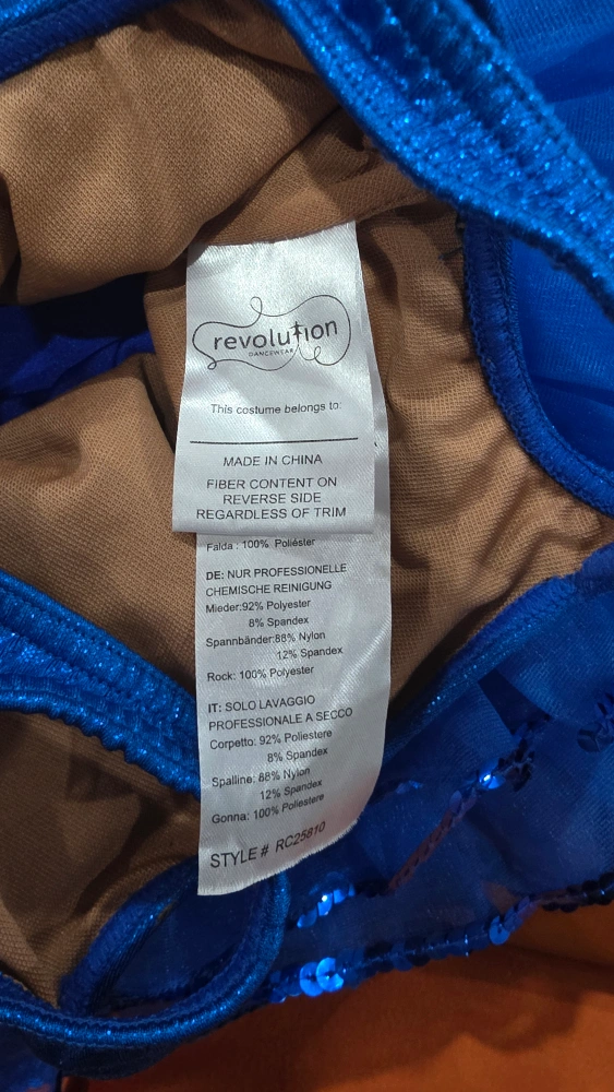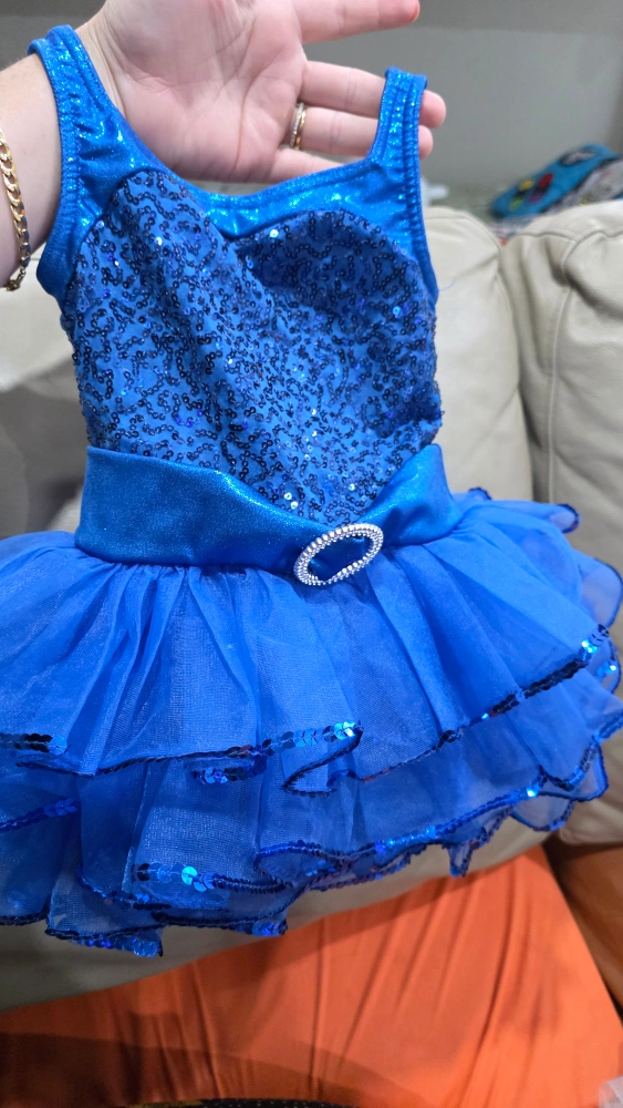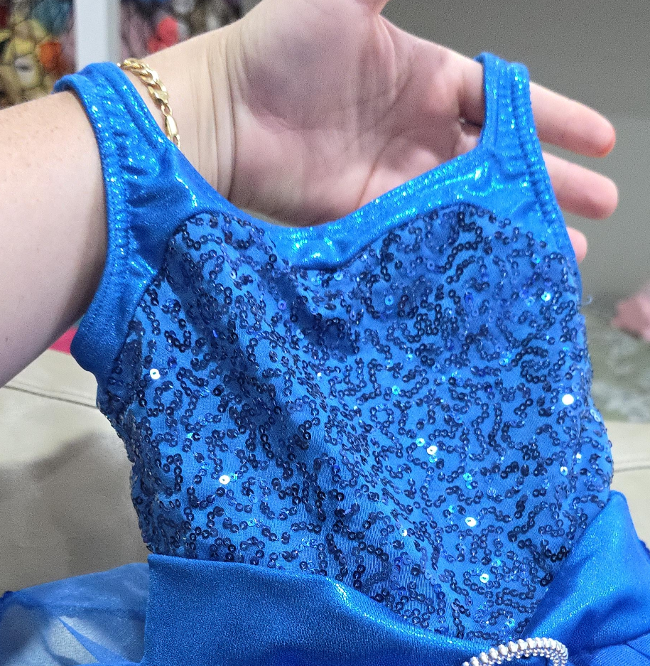 This adorable blue sequin tutu from Revolution Dancewear is perfect for your little dancer! The dress is size 3 and features a sparkly sequin bodice and a layered tulle skirt. The style number is RC25810. The skirt is 100% polyester and the body is 92% polyester and 8% spandex