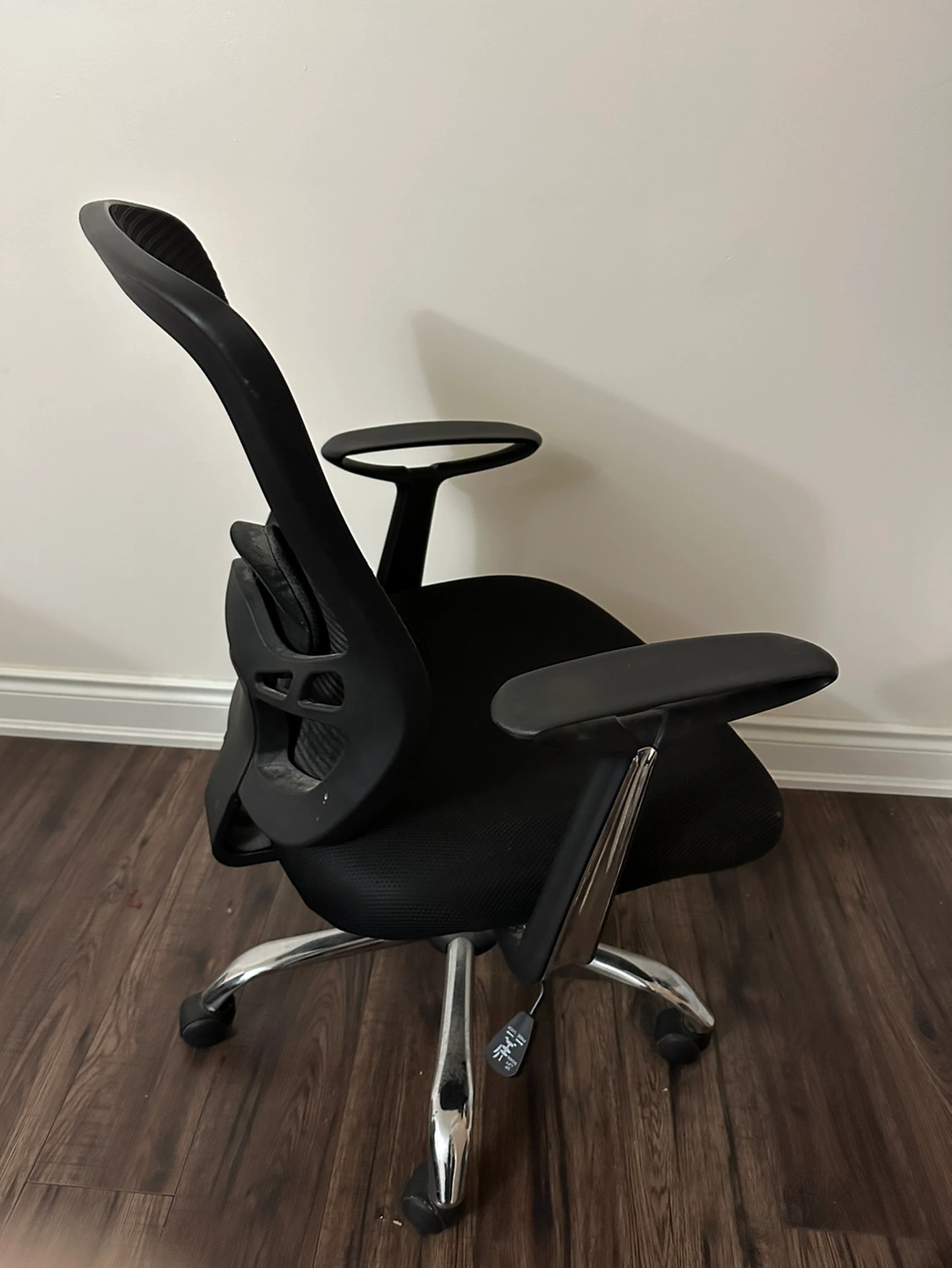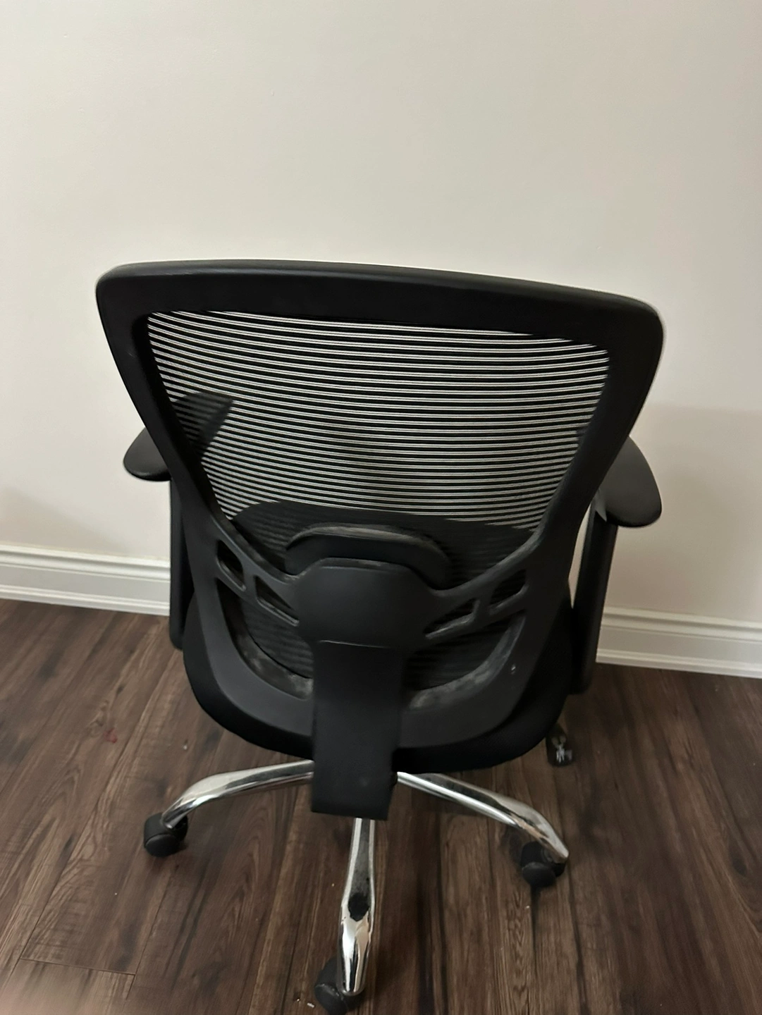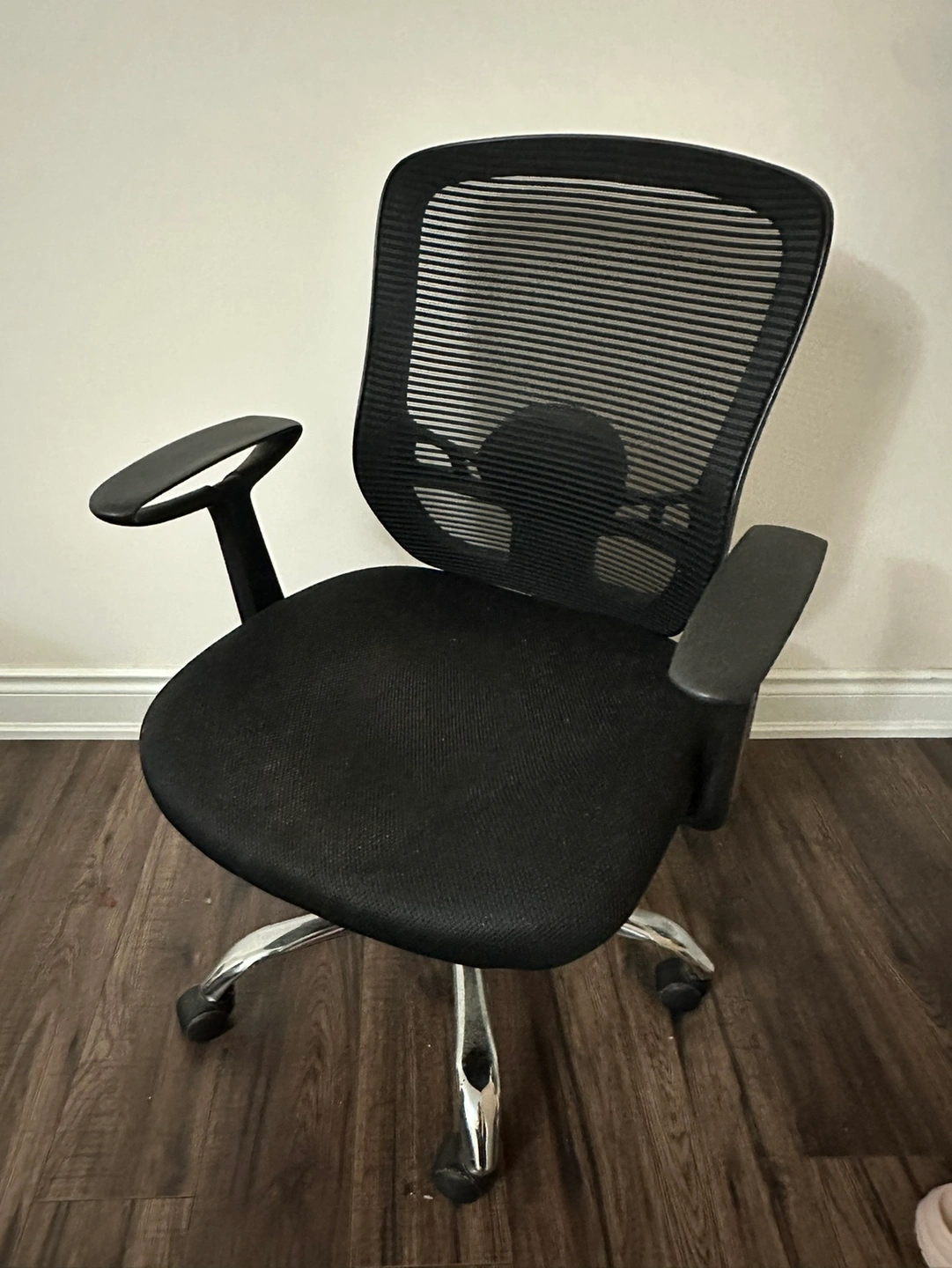 15Black mesh office chair with adjustable height and swivel base. The chair has armrests and casters. The seat and back are padded. The chair is in good condition.