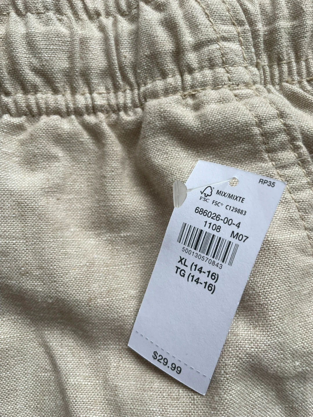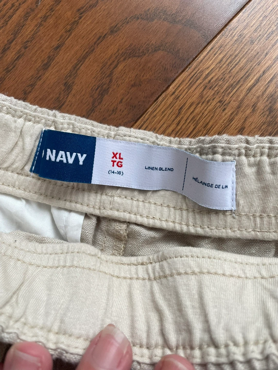 These beige Old Navy shorts are a size XL (14-16). They're made with a linen blend fabric for comfort. The waistband is elastic with a drawstring, and they have a relaxed fit.