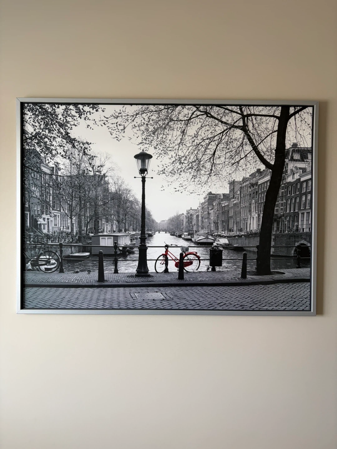 This framed wall art depicts a black and white scene of an Amsterdam canal with a red bicycle. It's a striking piece for any home decor. The frame is silver-toned metal. It's ready to hang!