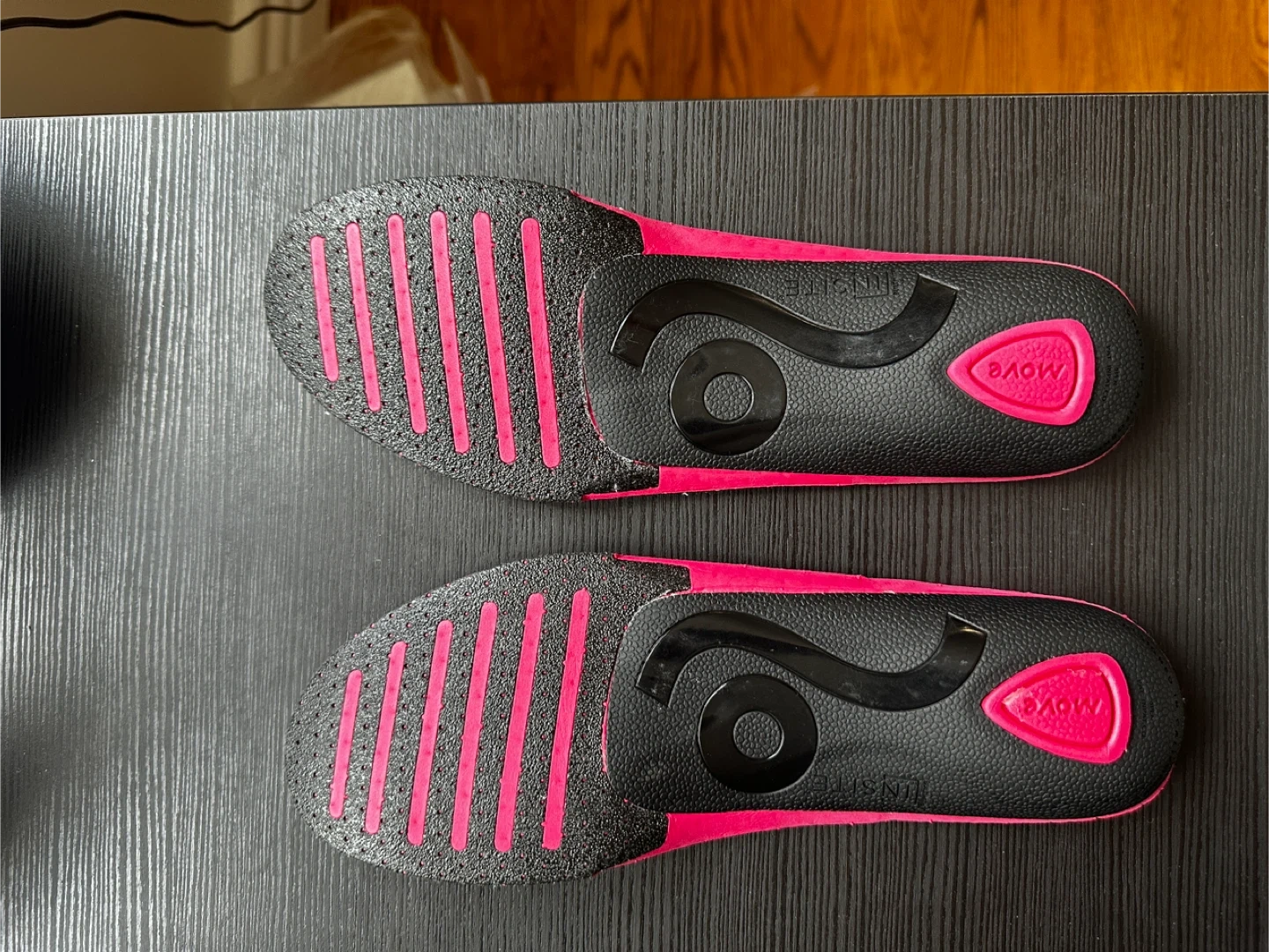 OOFOS Game Day Pro insoles provide support and comfort for your feet. They're designed for active individuals and come in a vibrant pink and black colourway. This pair is a size 8-10.