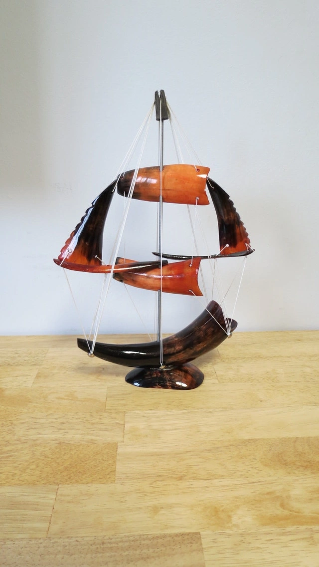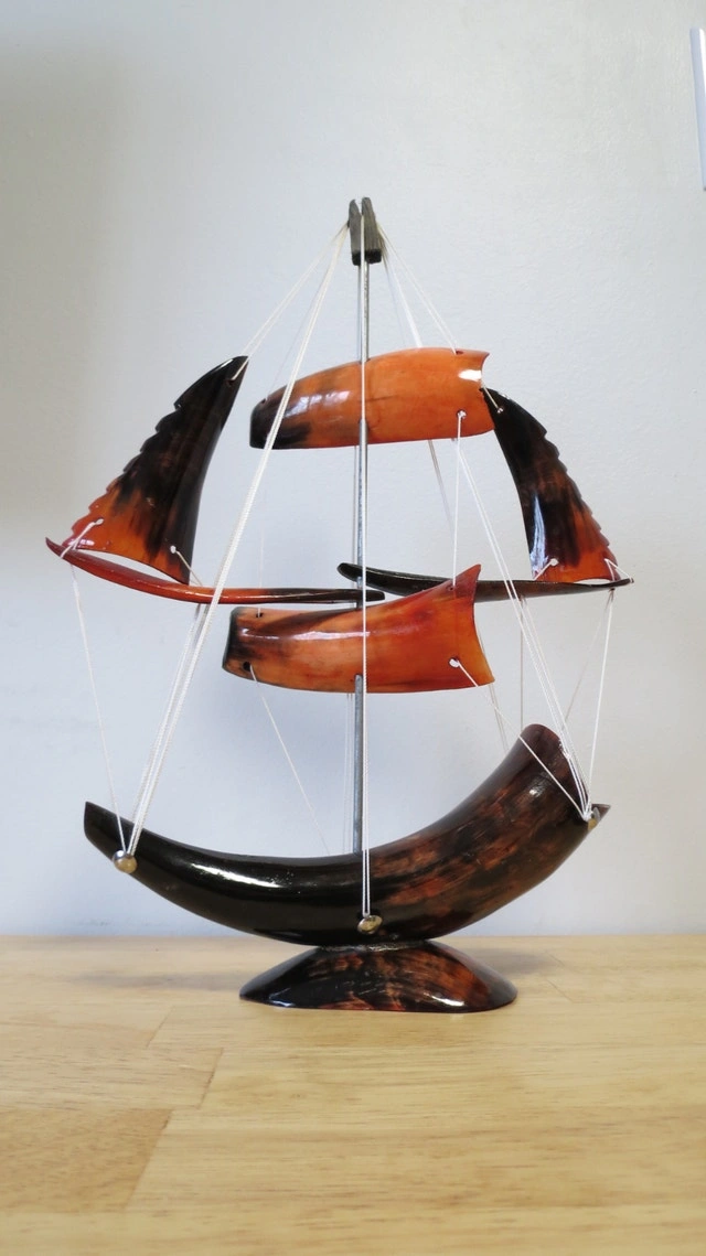 This is a beautiful, model ship made from polished horn. It features striking colors ranging from deep black to warm amber and orange, making it a unique decorative piece for any home or office. Features: Design: Intricate multi-sail ship with white rigging and a sturdy horn base. Condition: Great vintage condition. No cracks or chips; rigging is secure. Size: Perfect for a shelf, desk, or mantel display. A perfect gift for maritime lovers or collectors of unique folk art! Cash accepted.