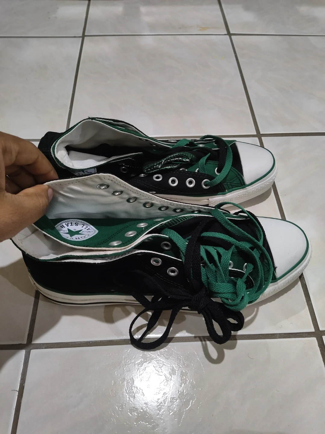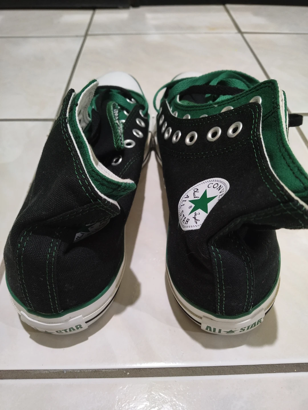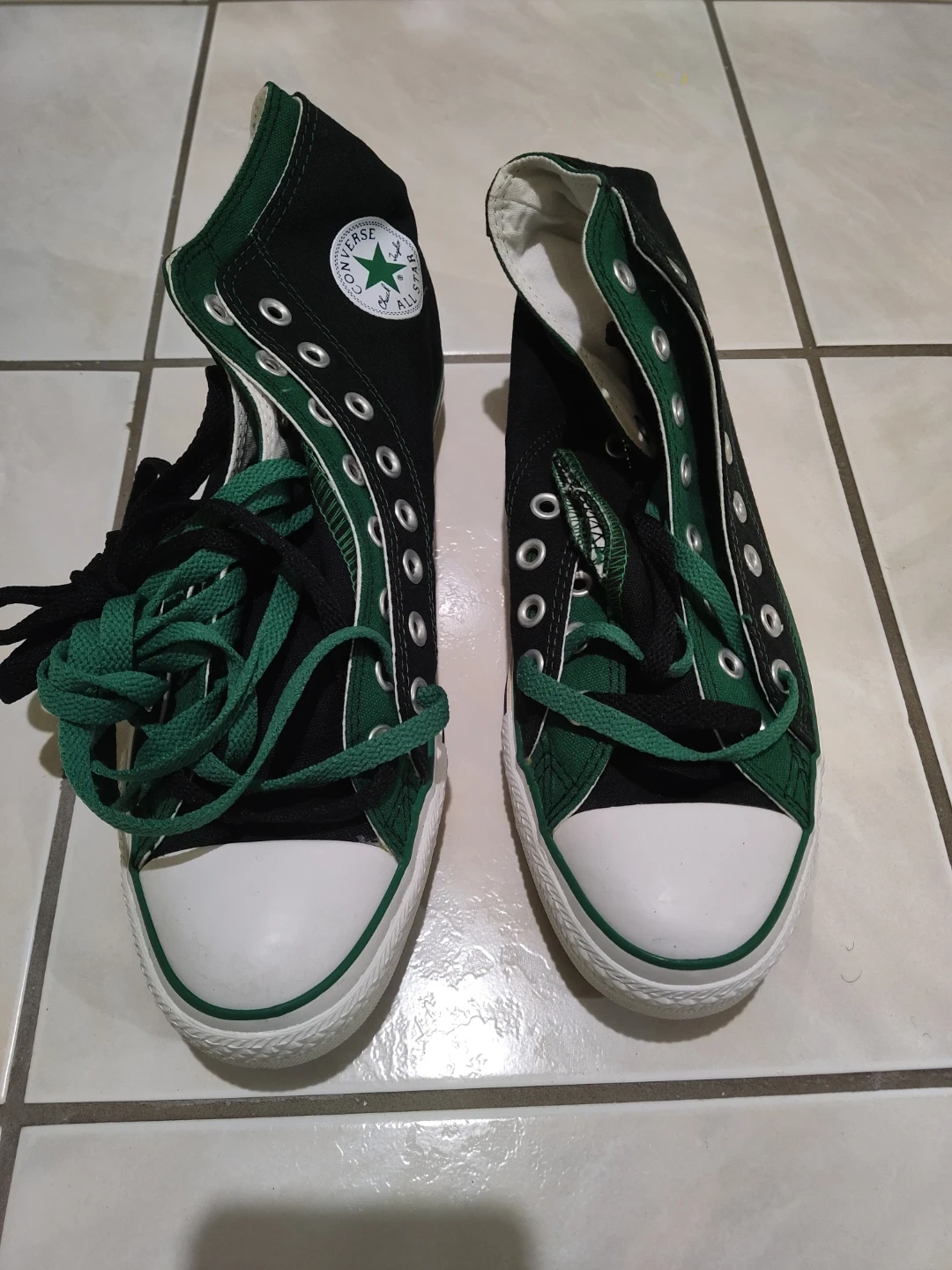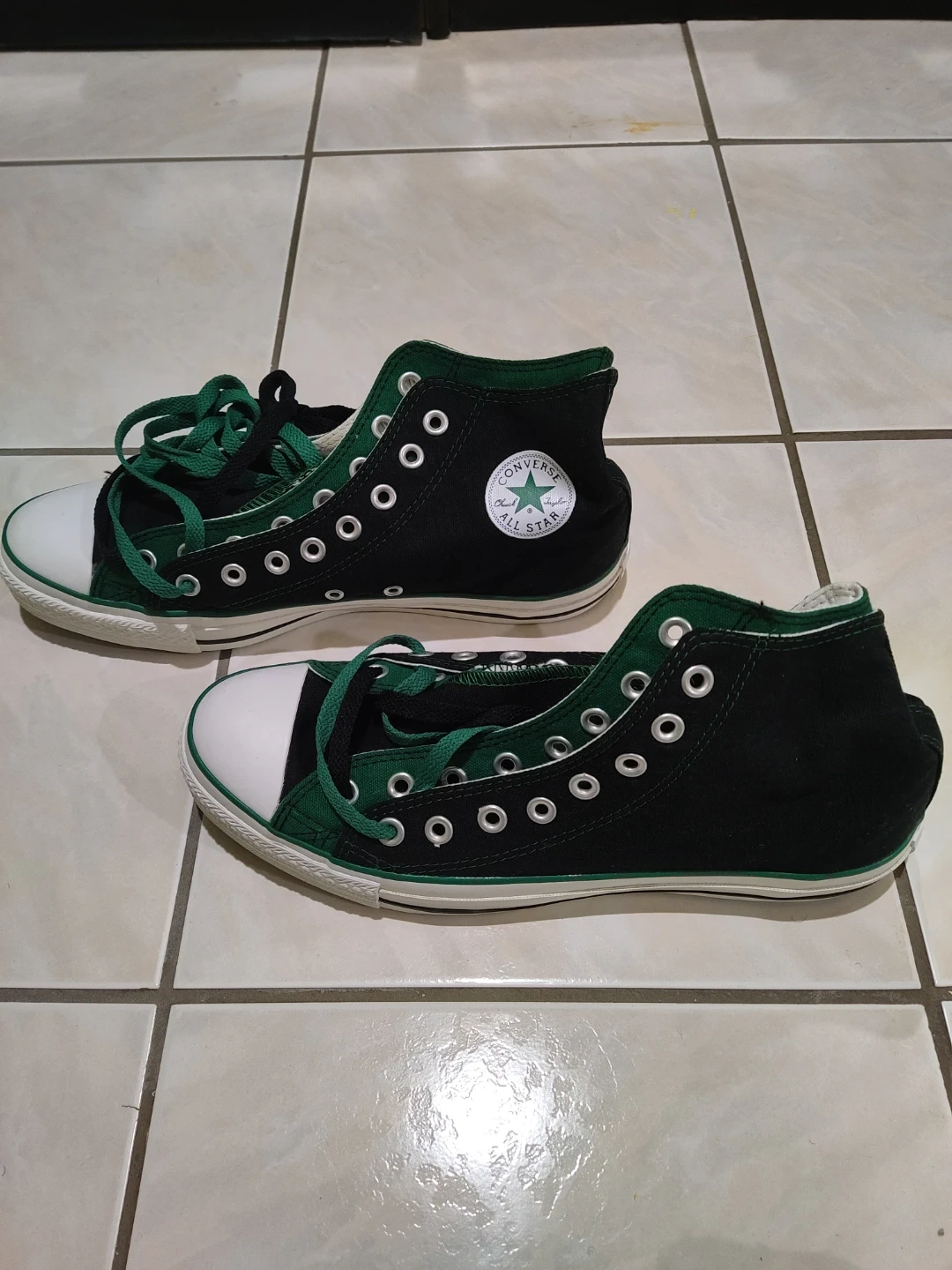 Classic black and green Converse All Star high-top sneakers. Features the iconic Chuck Taylor ankle patch and rubber toe cap. Canvas upper with rubber sole.