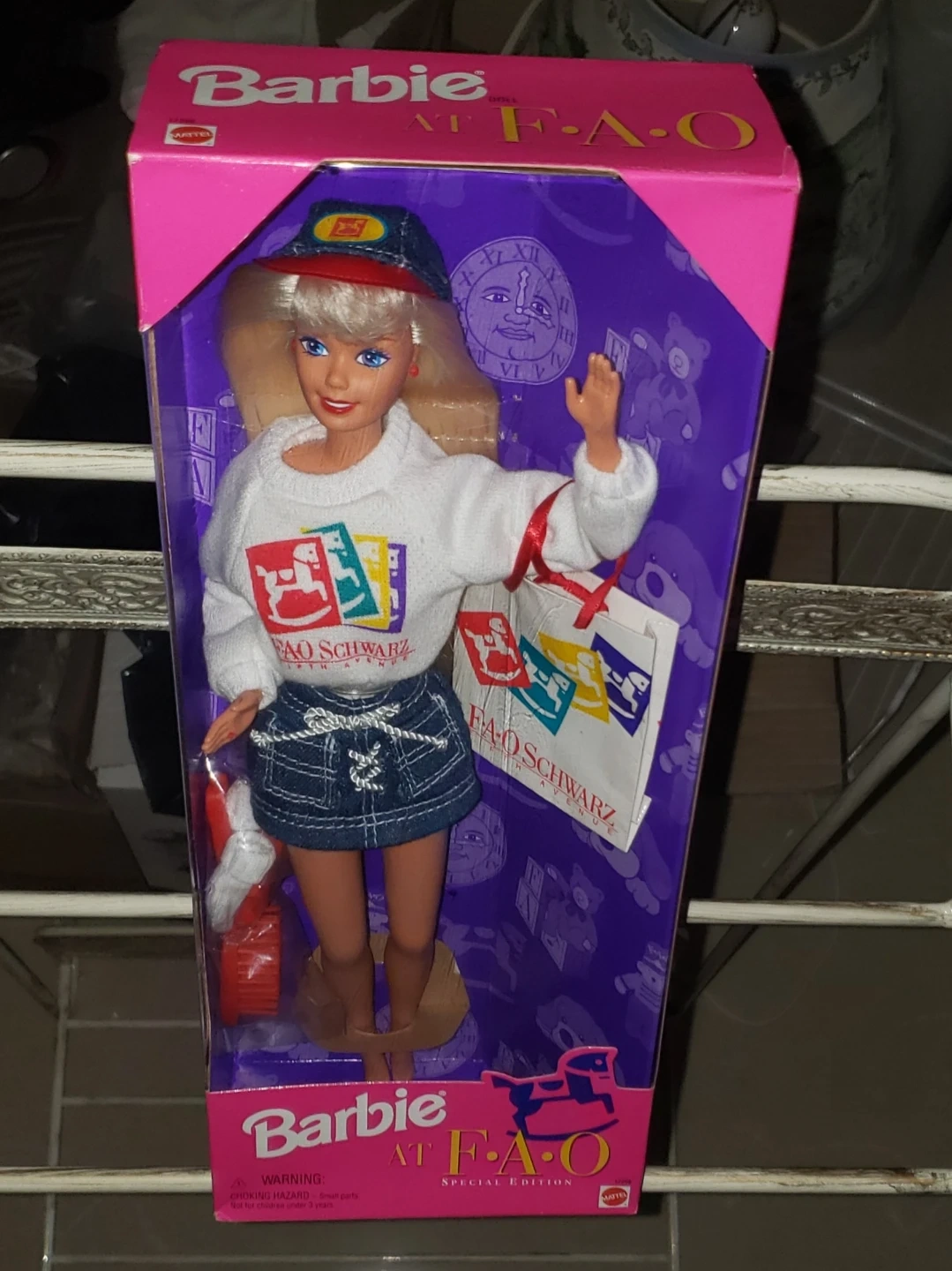 This is a Barbie doll special edition, made in collaboration with FAO Schwarz. The doll comes dressed in a white sweater and denim skirt. It includes accessories and is presented in its original box.