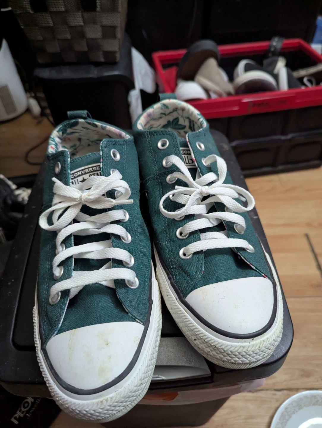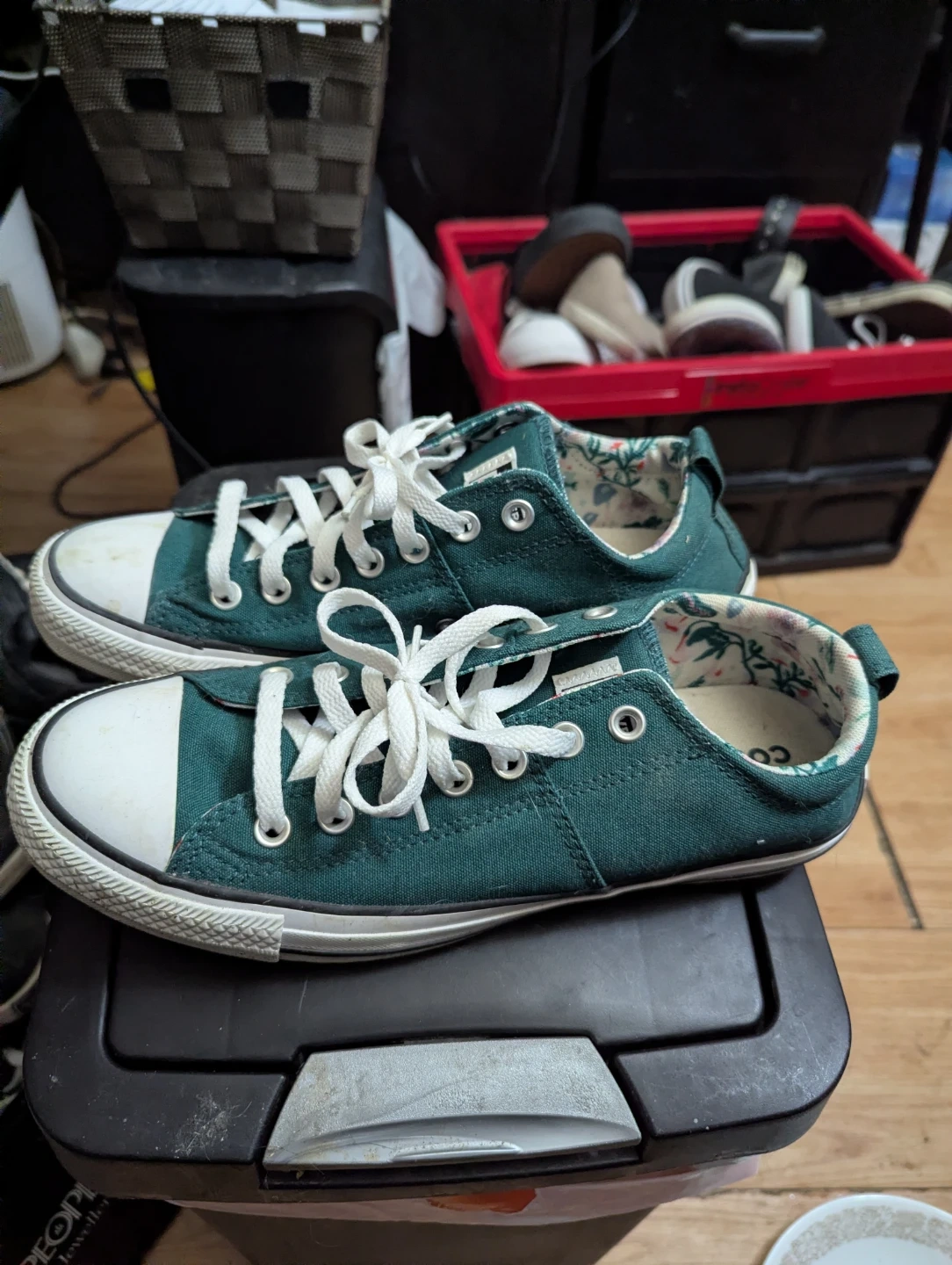Selling a pair of Converse All Star low top sneakers in women's size US 11! They're in good condition and ready for a new adventure. The colour is a lovely dark green, perfect for adding a pop of colour to your outfit