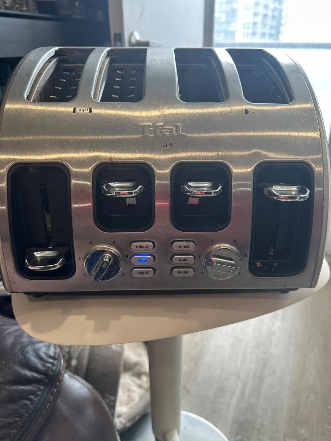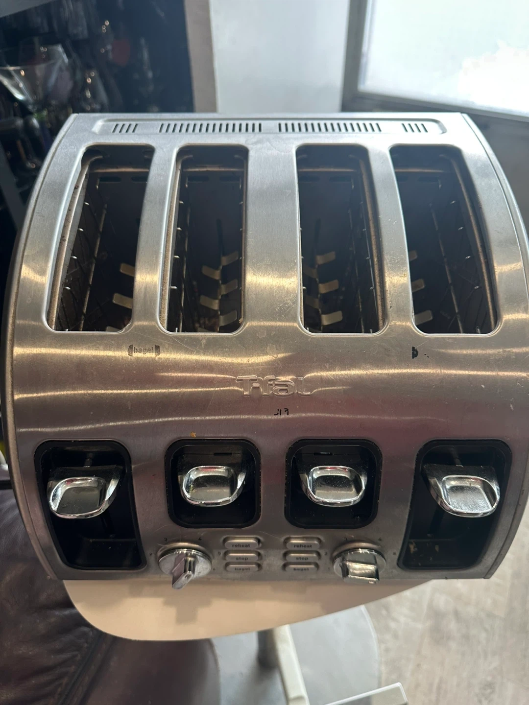 This T-fal toaster has a brushed stainless steel finish. It's a 4-slice model with reheat and bagel settings. Multiple browning levels are available.