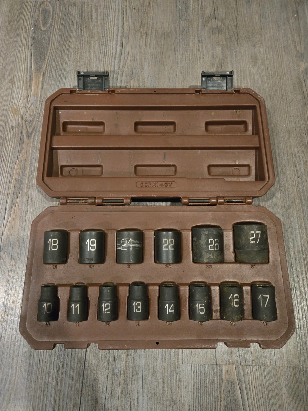 Matco Tools ADV 14-piece socket set in a brown/burgundy carrying case. Includes sockets ranging from 10mm to 27mm. It's a metric socket set. A handy set for mechanical work!