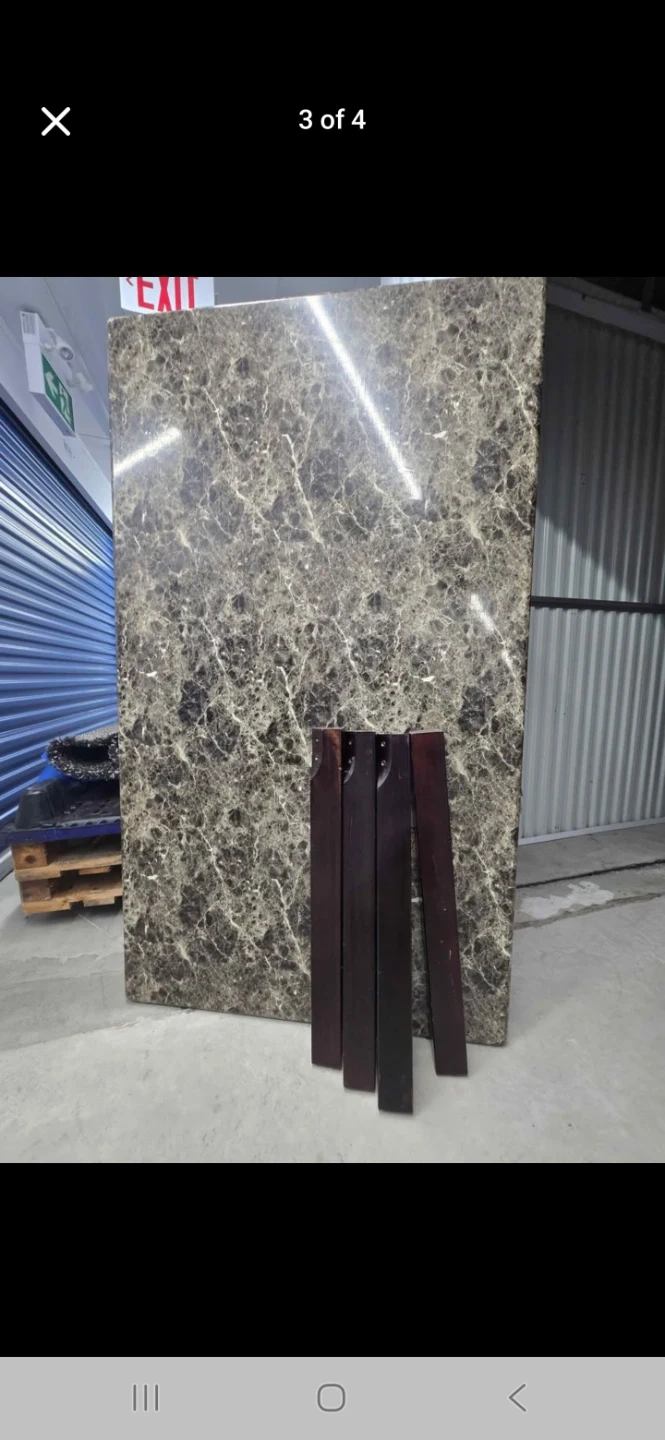 Six dark brown dining chairs with modern square cut-outs in the backrests. The set includes a large marble-patterned table top and four dark wood table legs. This dining set is ready for a new home table is bit lose its free only chairs are 90$