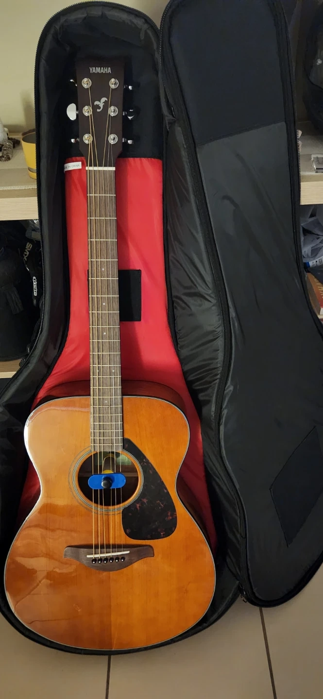 Yamaha FS800 acoustic guitar with a natural wood finish. It comes with a black gig bag for transport and storage. This guitar is ready for your next jam session!