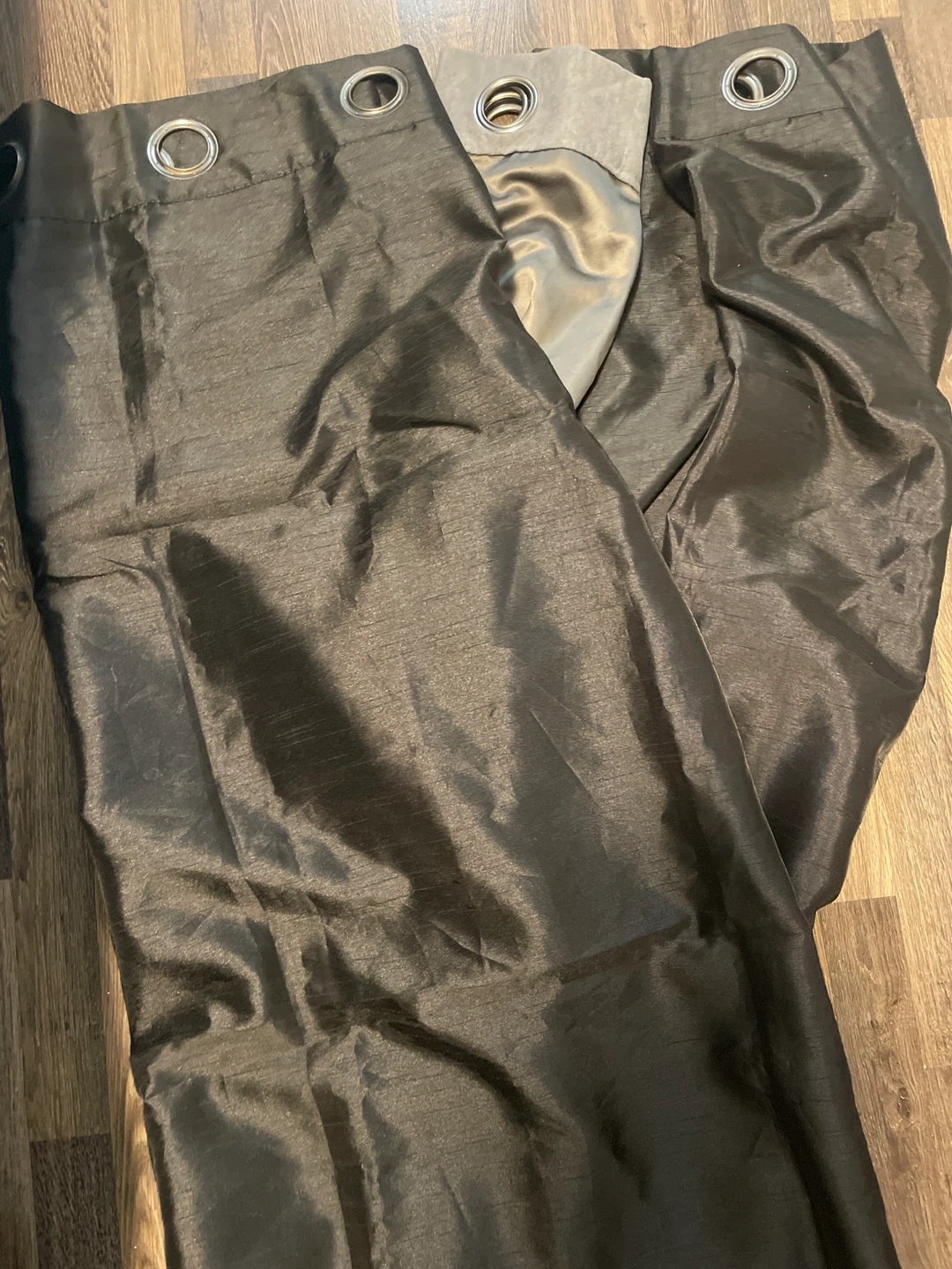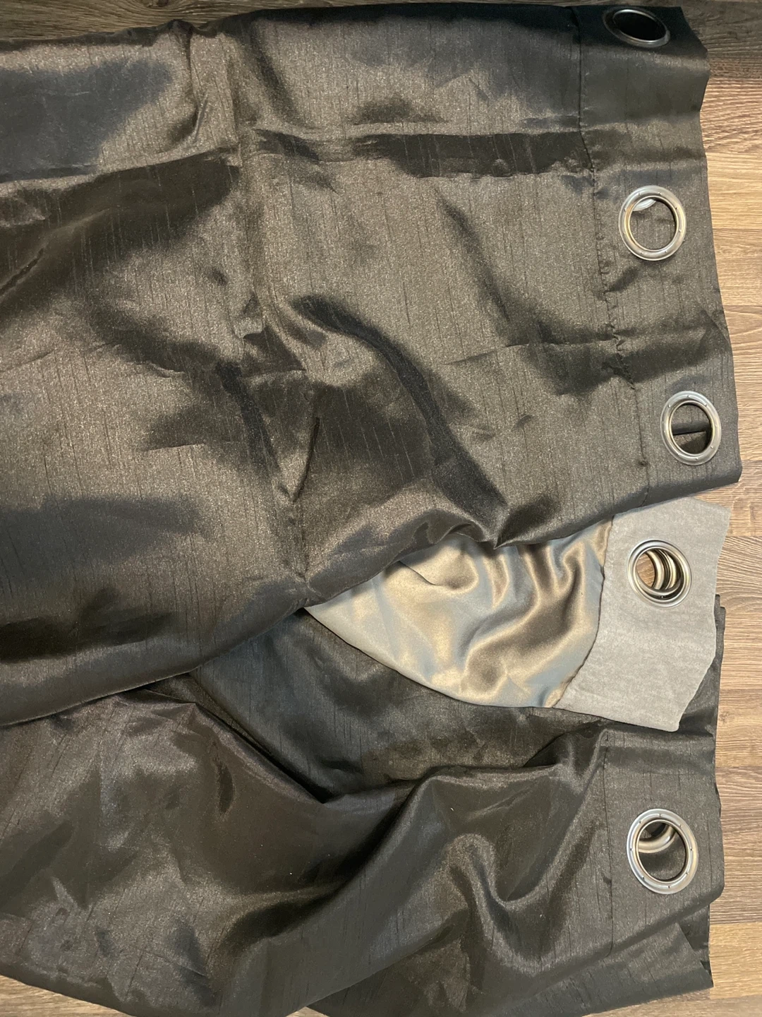 Two black curtain panels with grommets. These curtains have a slight sheen and are lined with a grey fabric. They're suitable for adding privacy and blocking light.