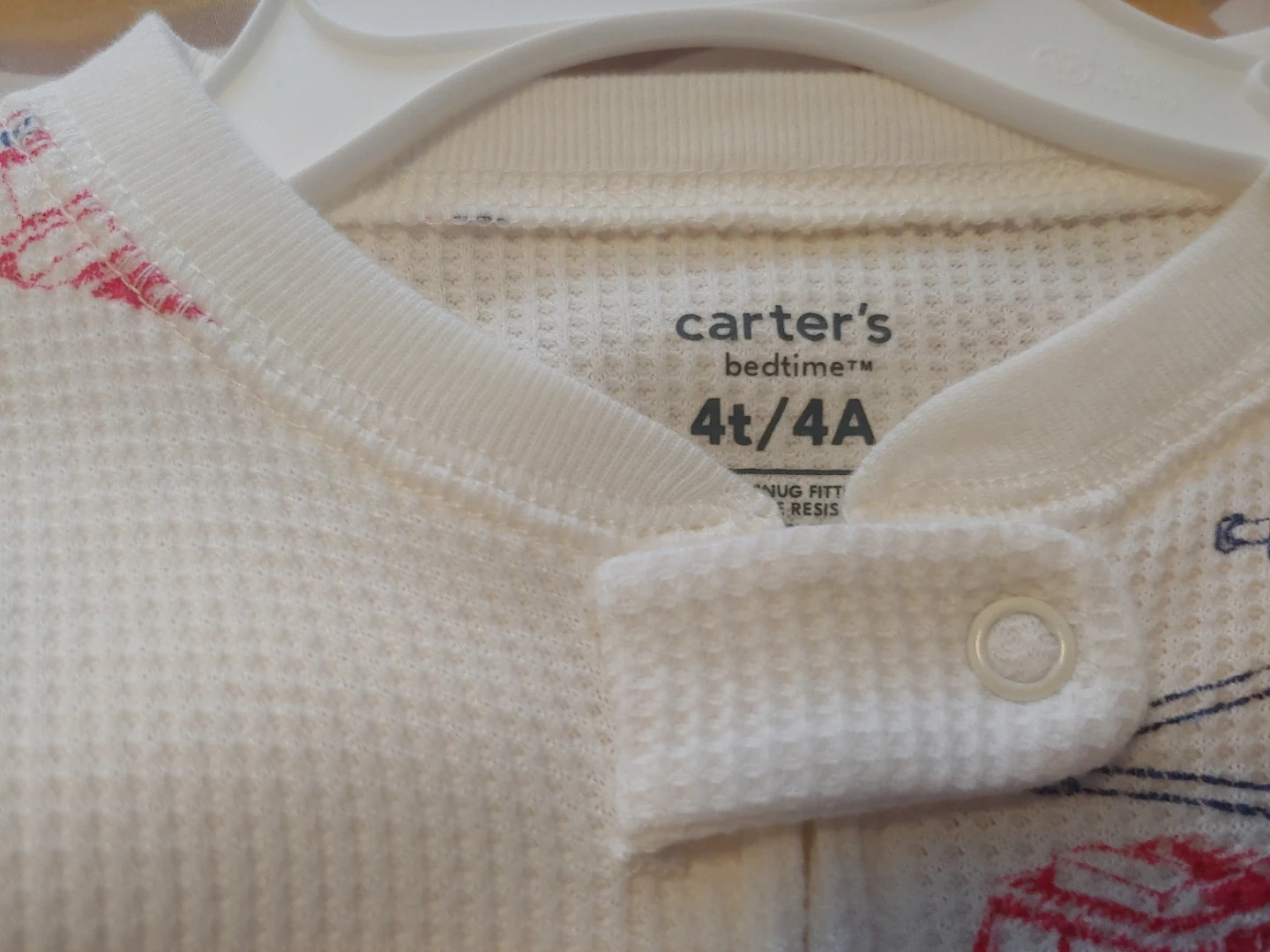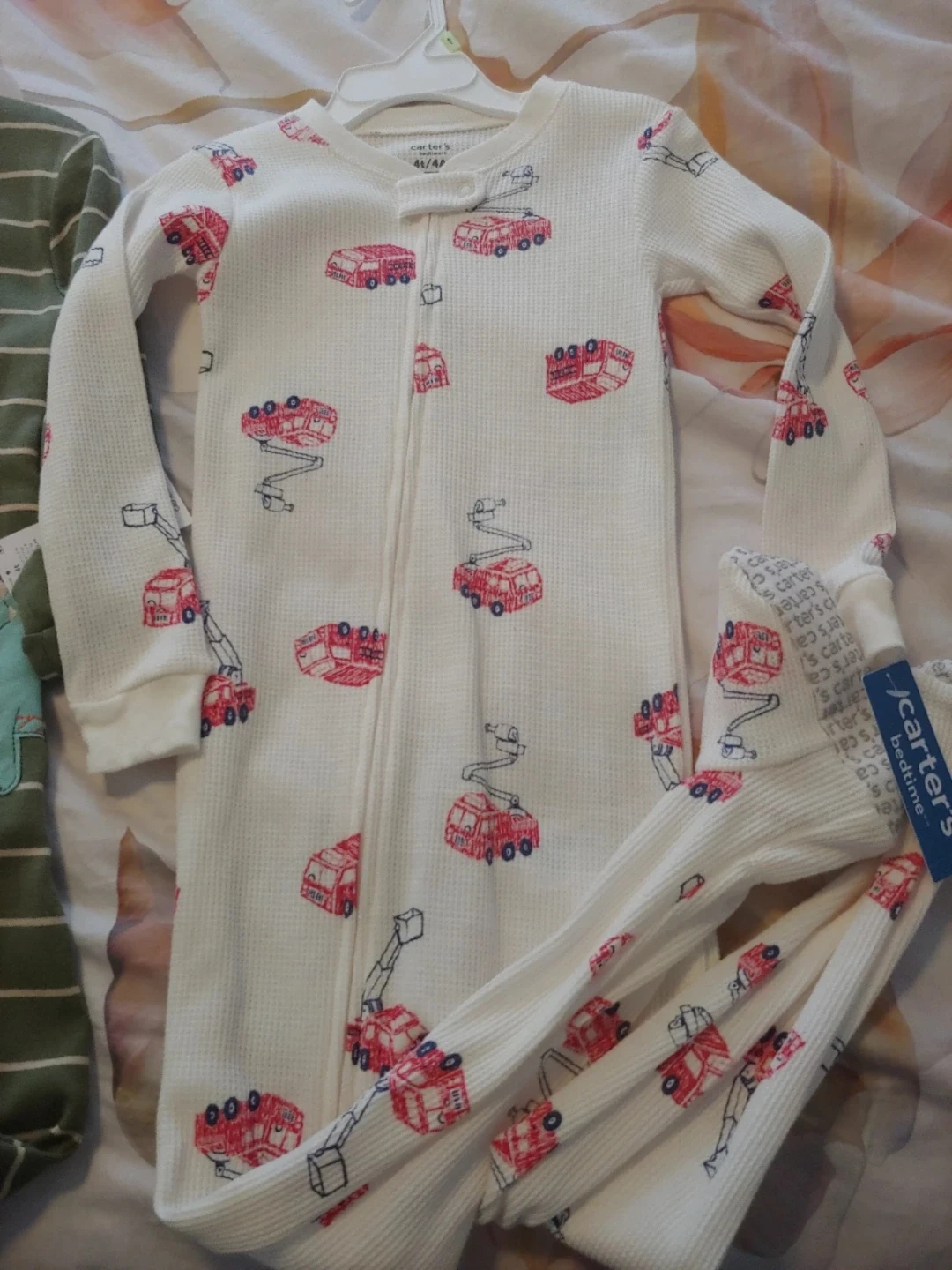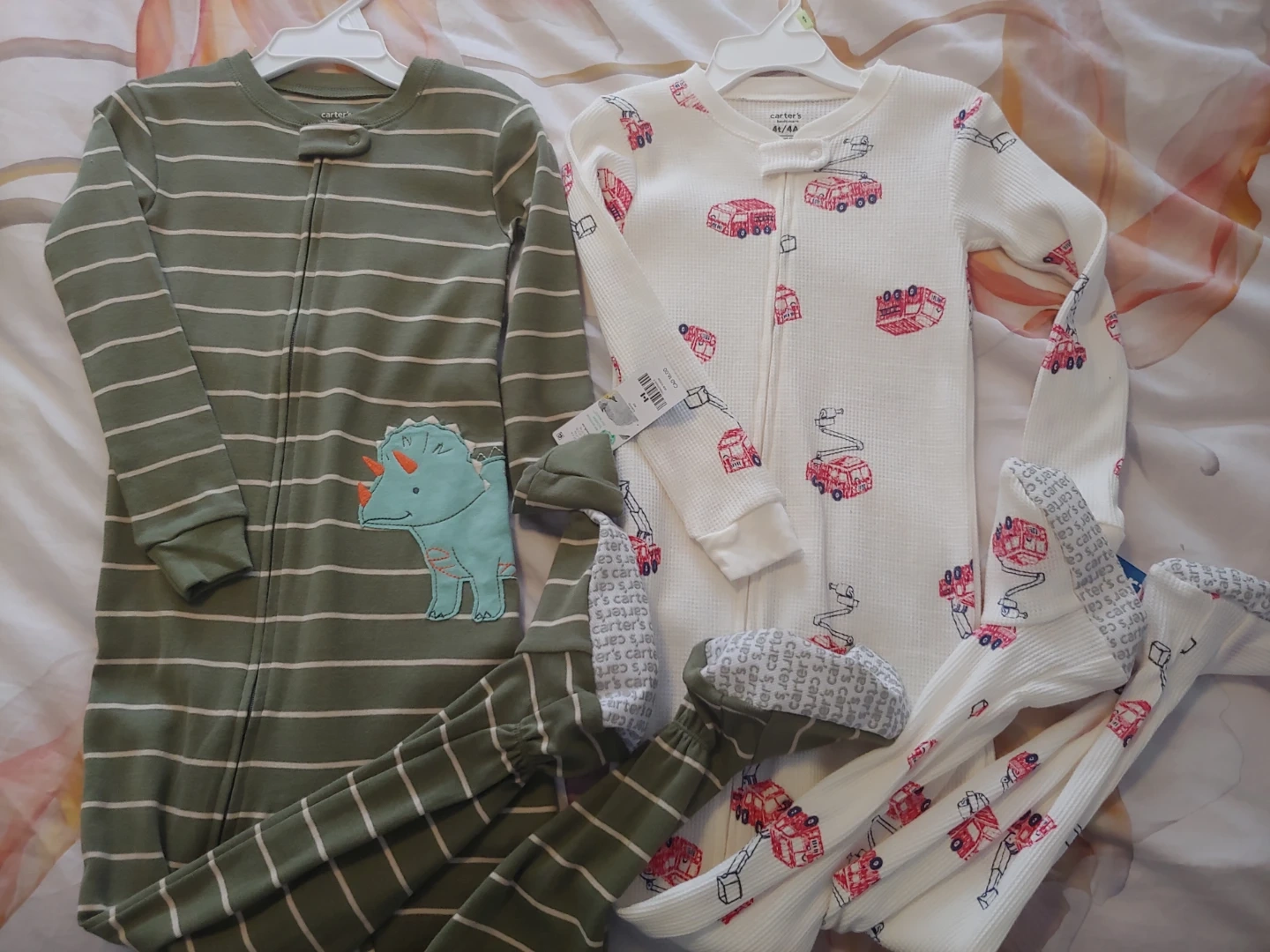 Two Carter's Bedtime footed pajamas in size 4T boys. One features a fun fire truck print on a white thermal background. The other is green with white stripes and a cute dinosaur patch. Both are snug fitting. New with tags. Both for $10