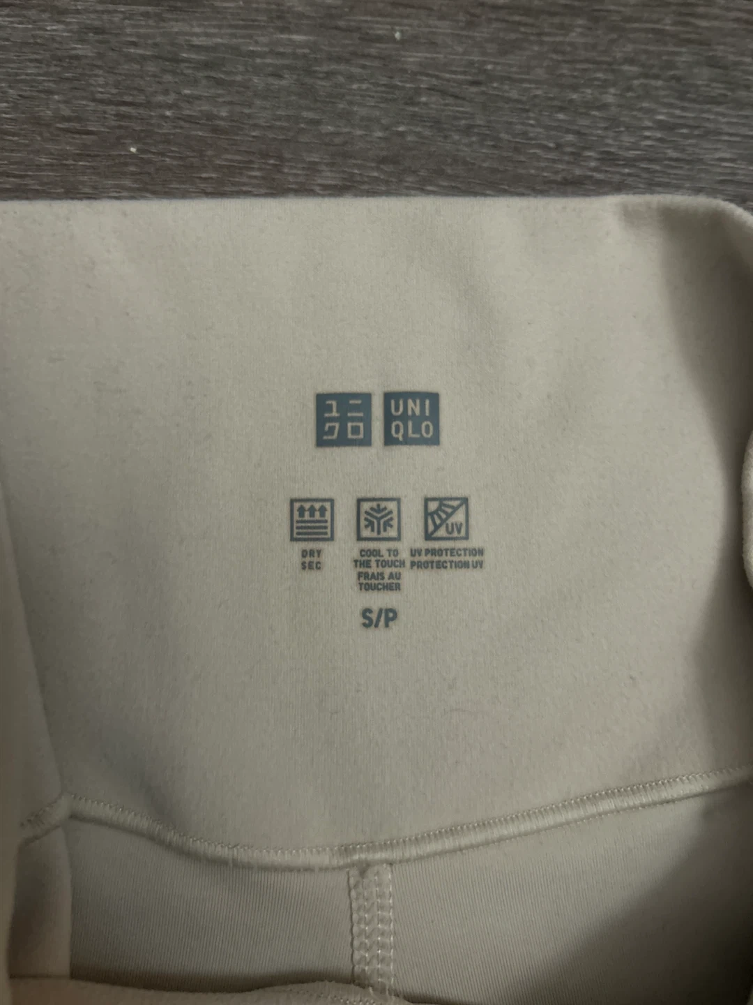 Selling a pair of Uniqlo leggings in beige. They are a size small and feature a dry-sec material with UV protection. These leggings are perfect for workouts or just lounging around