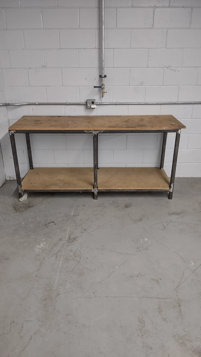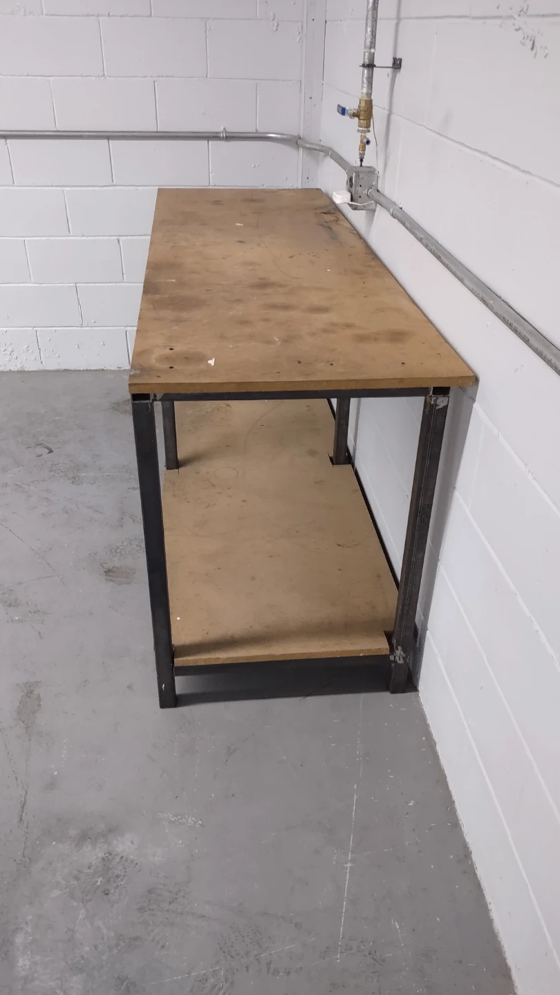 Industrial style shop table with steel frame and interchangeable tabletop. Good for garage or warehouse business.