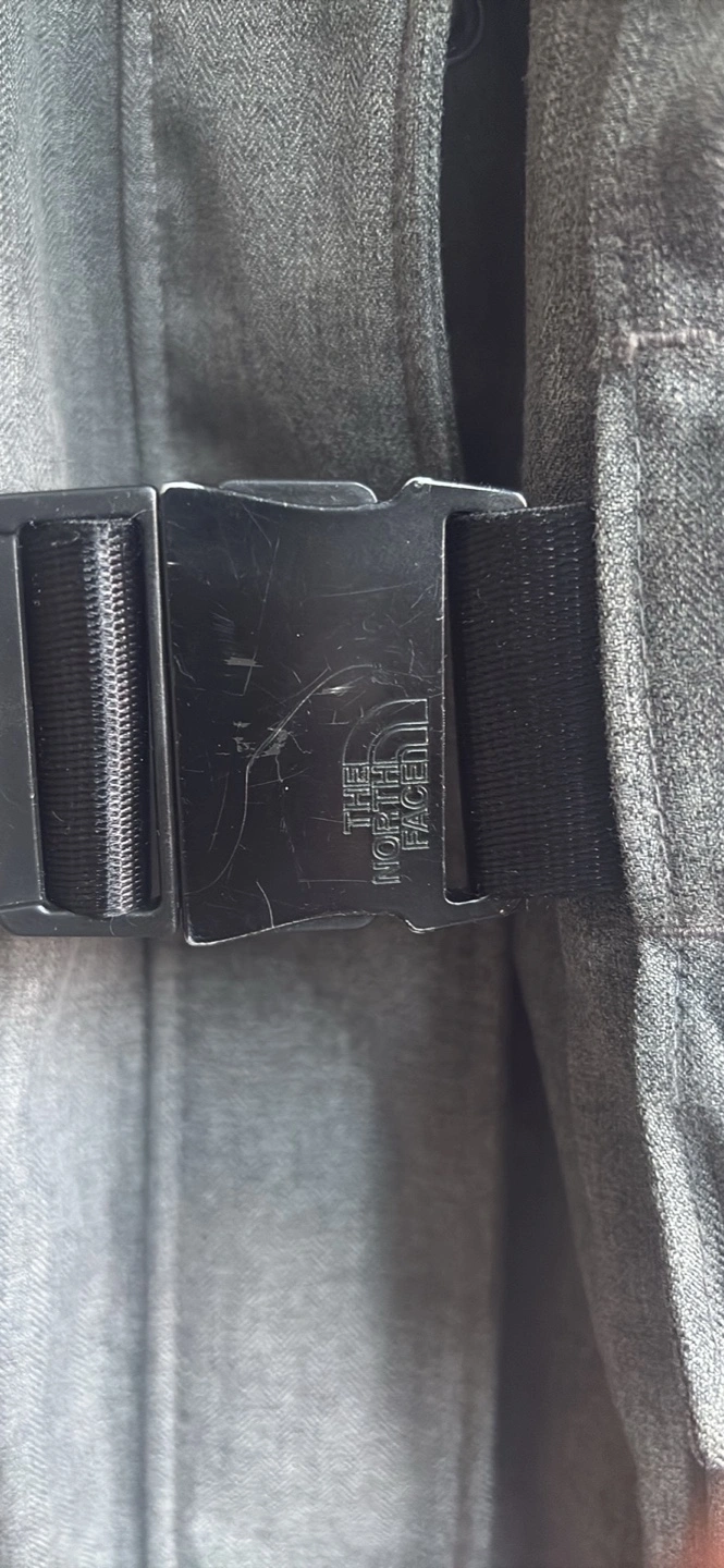 Women's parka, dark grey colour. Features a hood, belted waist, and down fill.