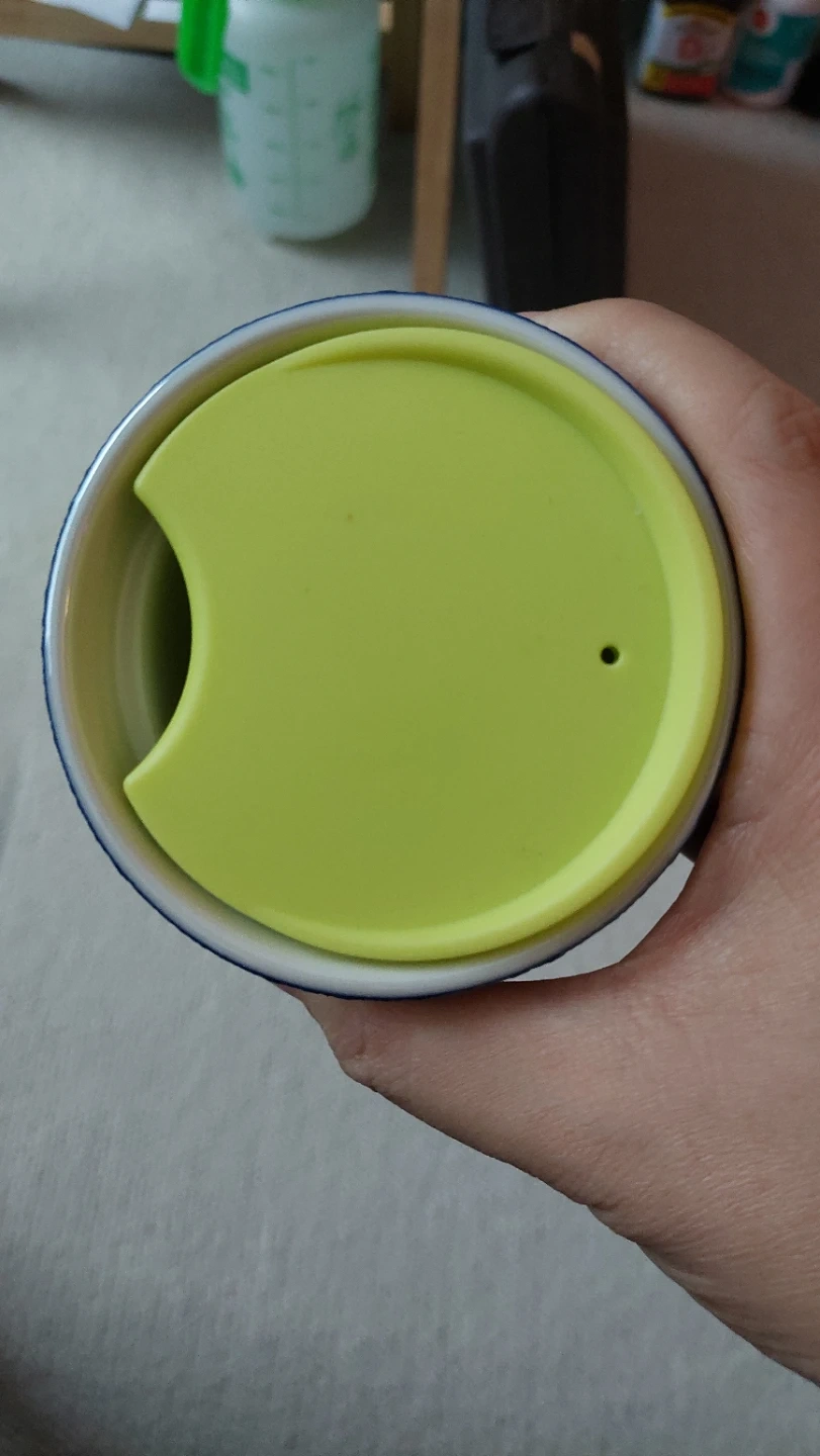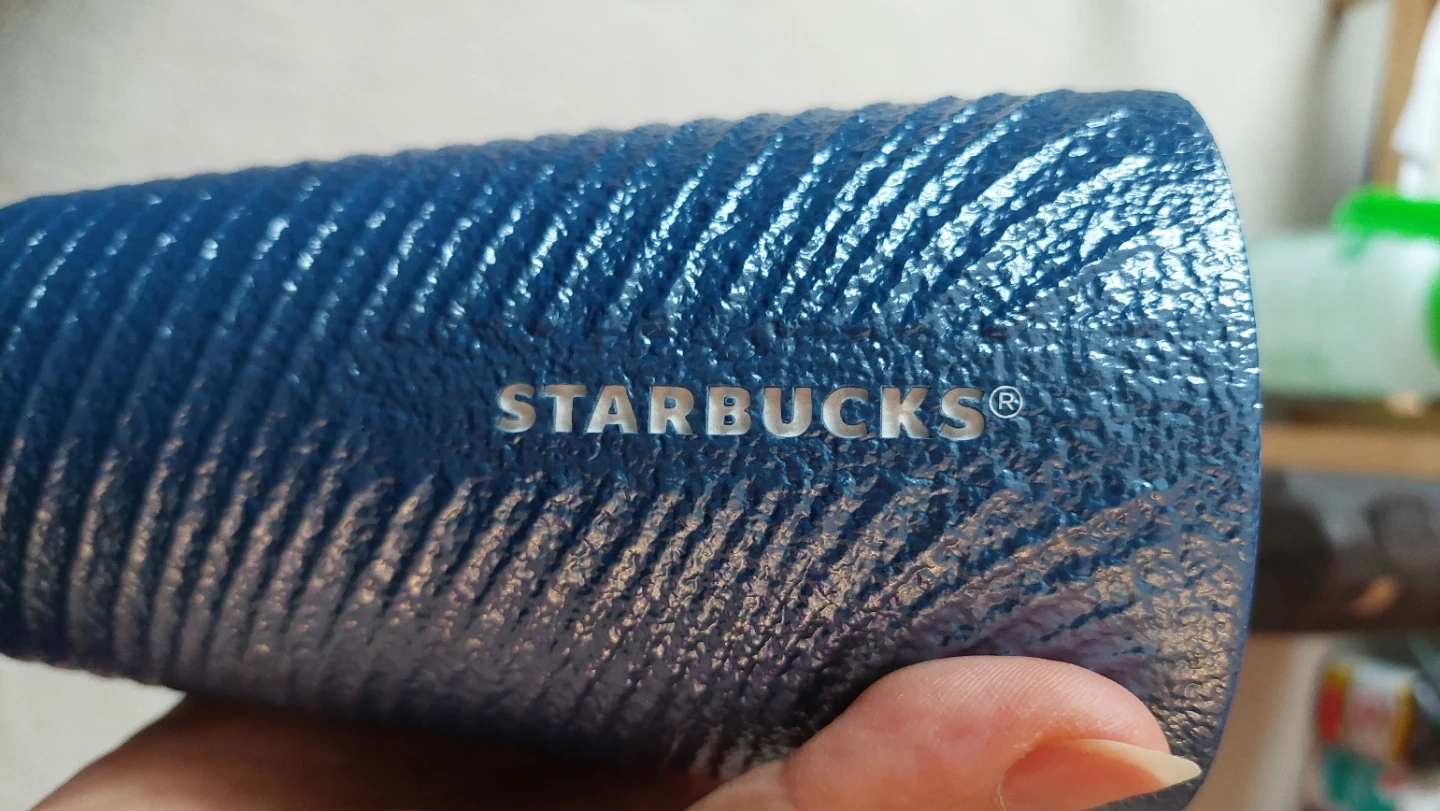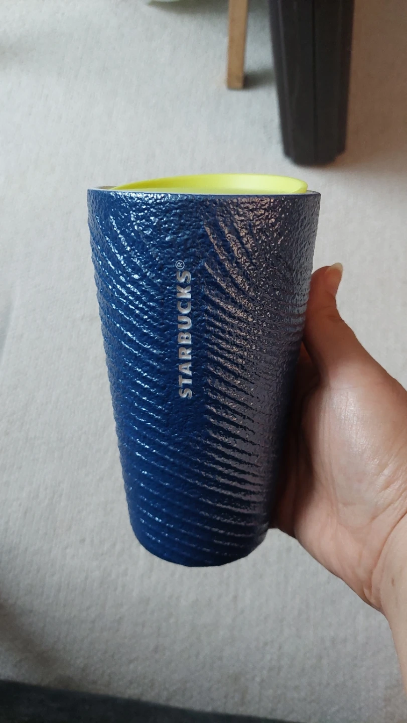 Starbucks blue wave metallic textured tumbler with neon yellow lid. It's 12 oz or 355 ml. Hand wash only.