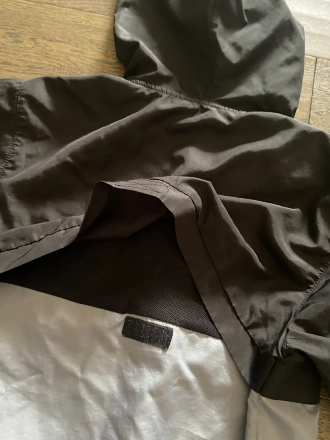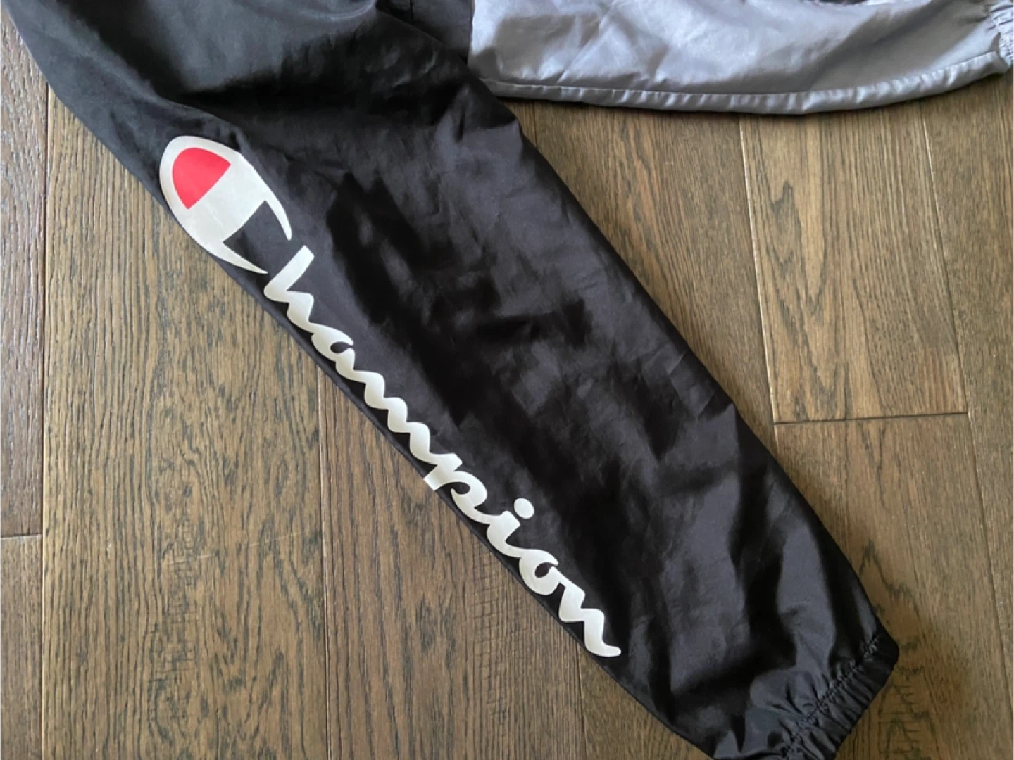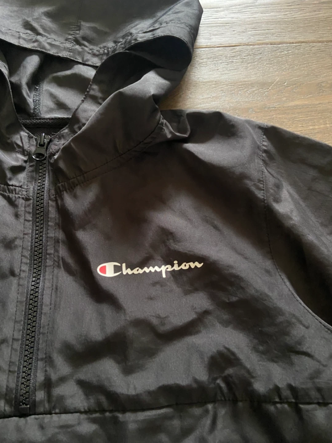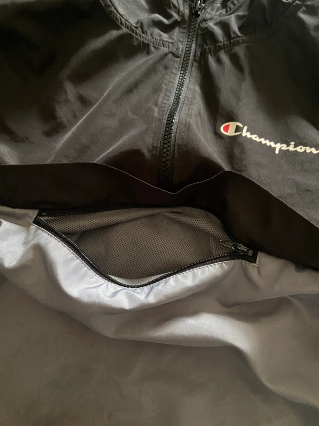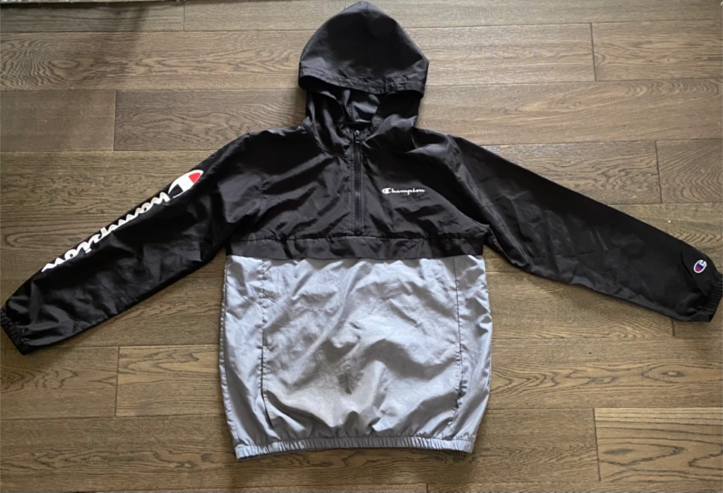 This is a black and grey Champion windbreaker jacket in youth size large