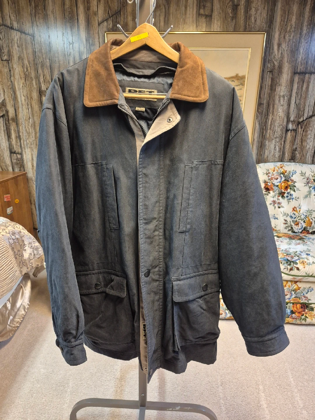 60Selling a men's RFT jacket in size XL. The jacket is a stylish grey colour with a brown corduroy collar. It features a quilted lining for extra warmth. Great for those cooler days!