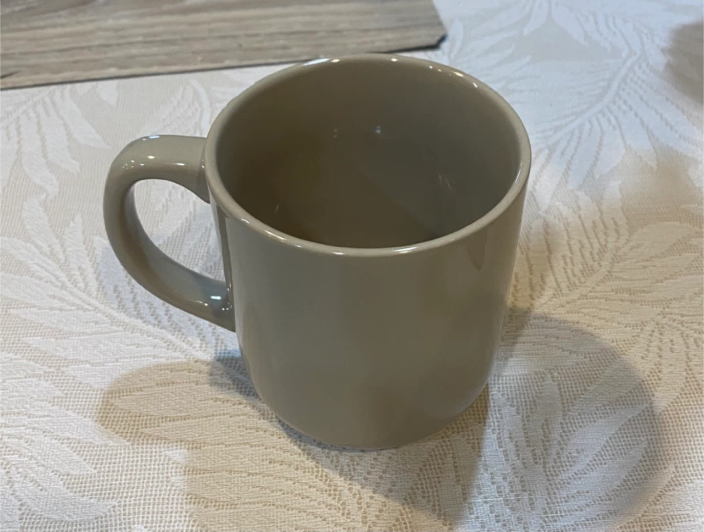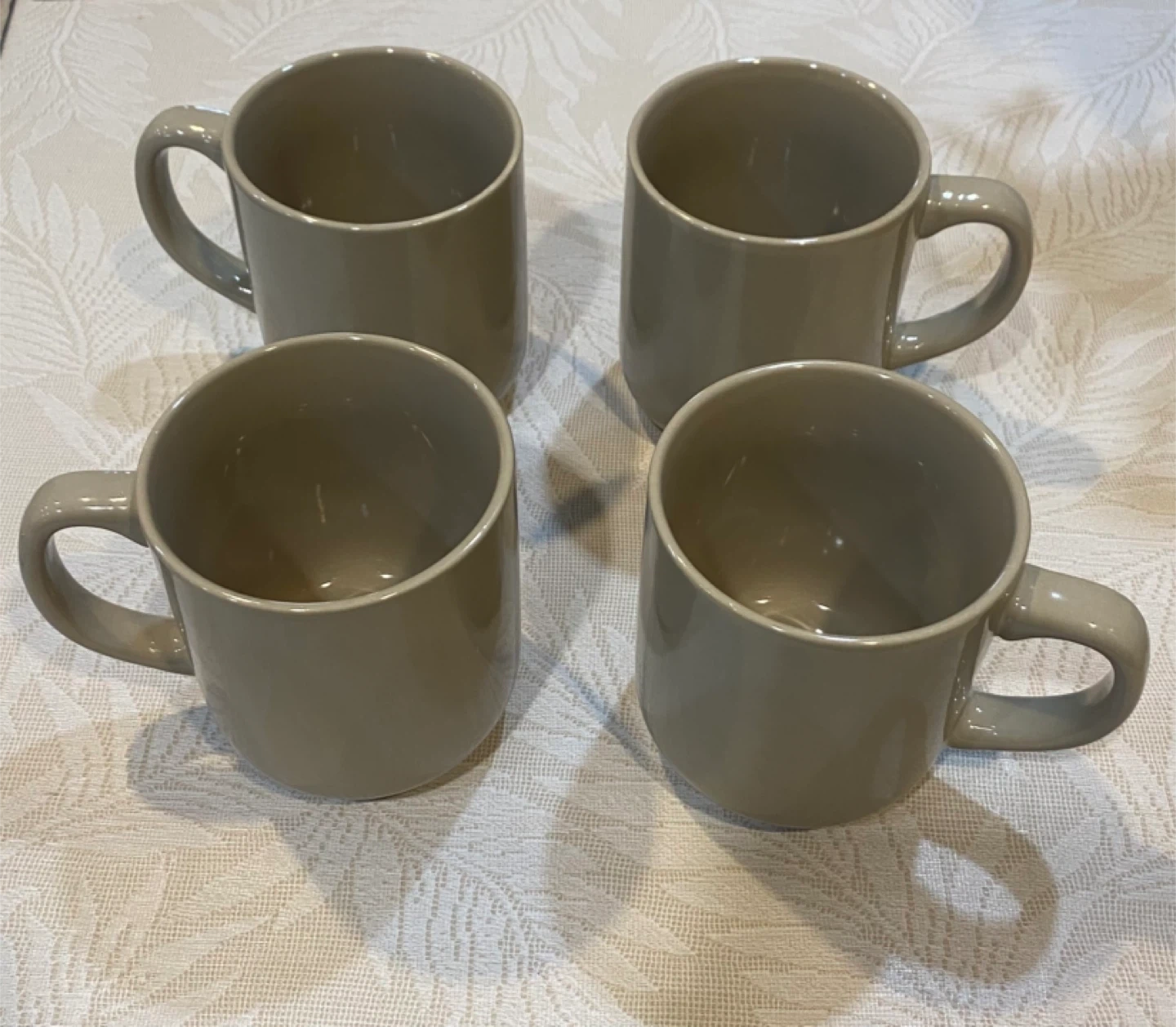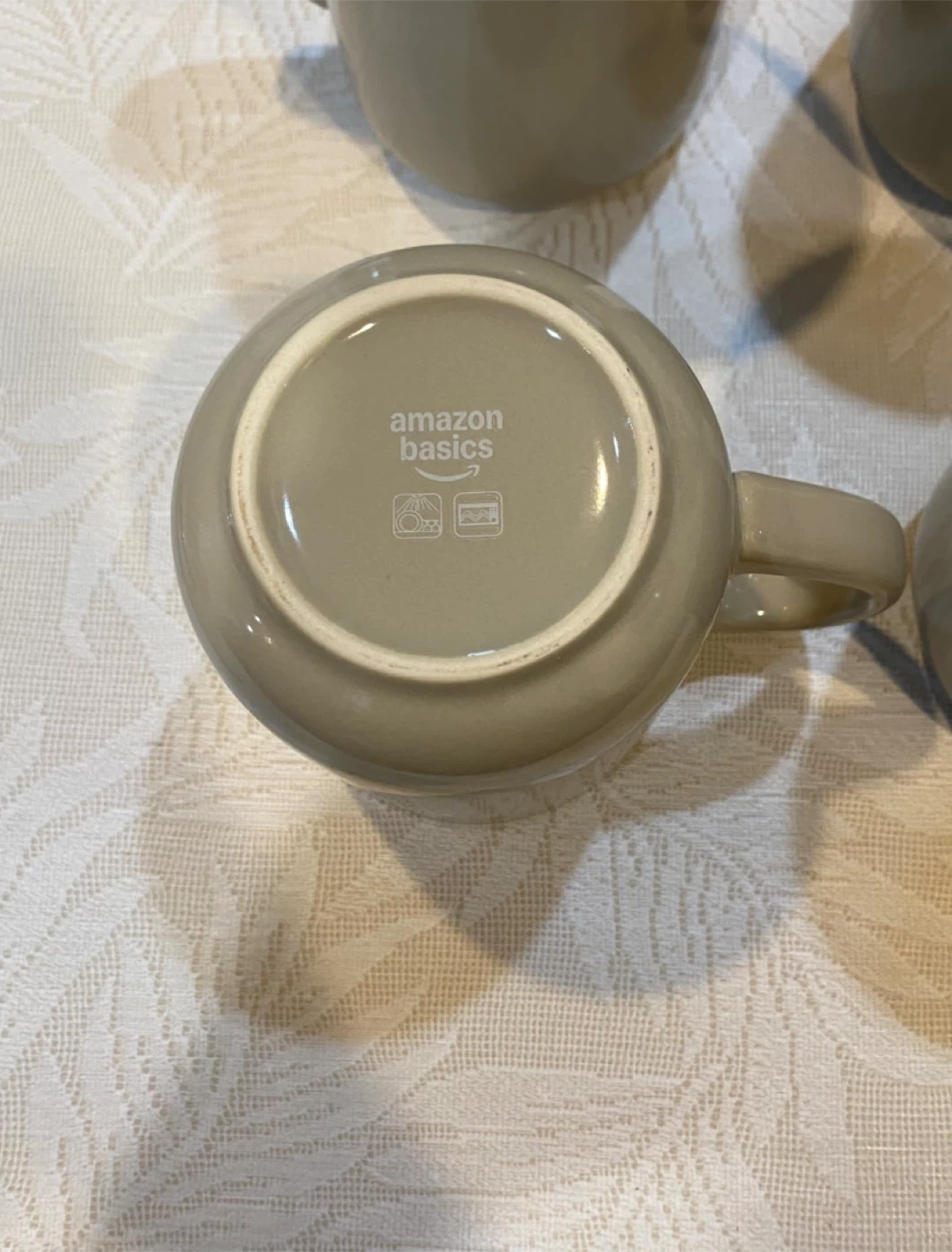 Set of four beige Amazon Basics mugs. Ceramic material. Dishwasher and microwave safe.