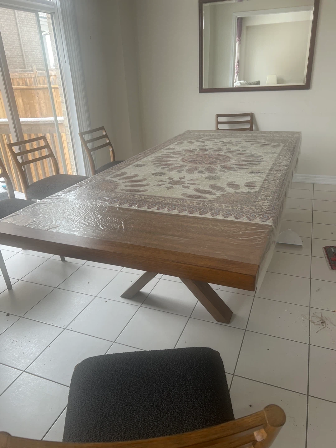 A sturdy wooden dining table with a decorative tablecloth. It comes with eight matching chairs featuring dark upholstered seats. This set is perfect for family meals and gatherings.