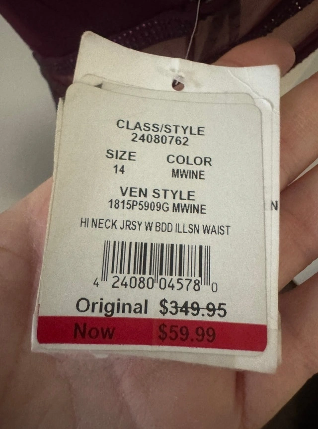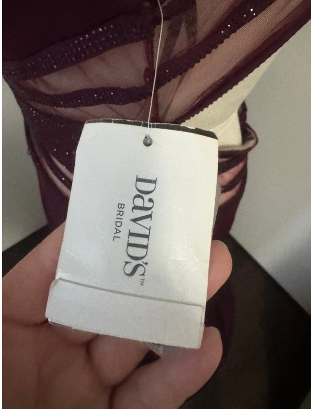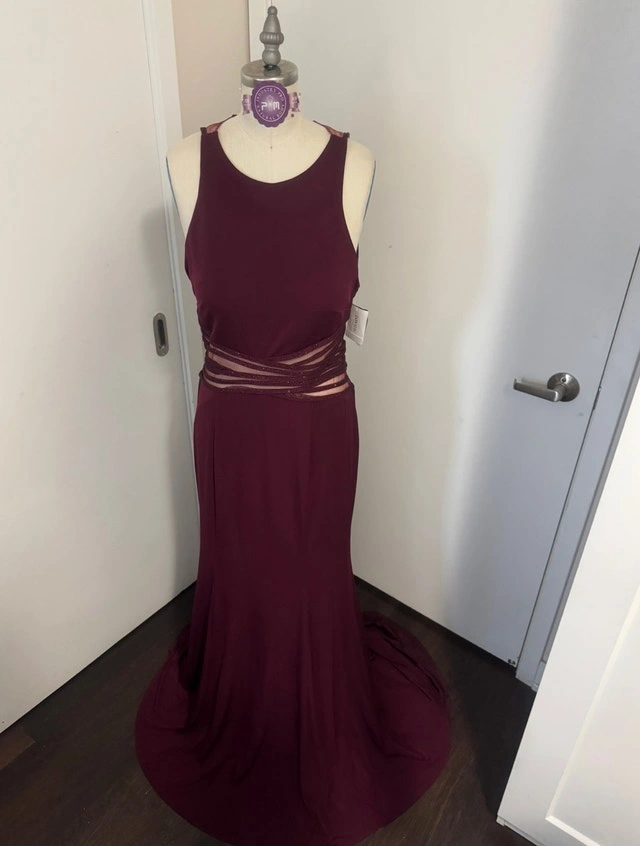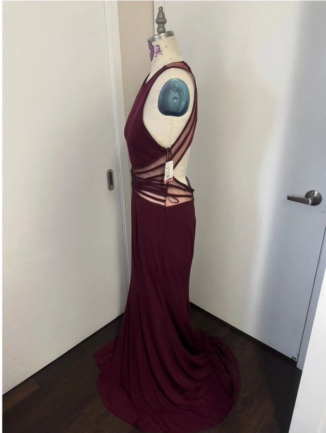 Beautiful Merlot wine coloured special occasion evening dress, ladies size 14. It's brand new with tags on and has never been worn. The dress features a stunning open back. Please note, it is missing two small buttons that go at the back of the neck to secure the dress. This requires a small mend, which is why it was purchased on sale. Two hook and eye closures from Dollarama would be an easy fix. Selling because I've lost weight and it no longer fits. Pick up is in the lobby of my condo in Scarborough, near Finch and McCowan. Check out my other ads for more ladies' dresses!