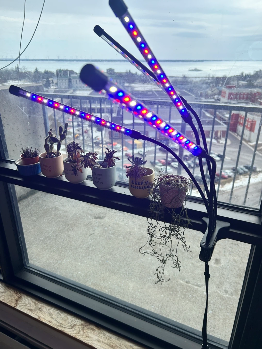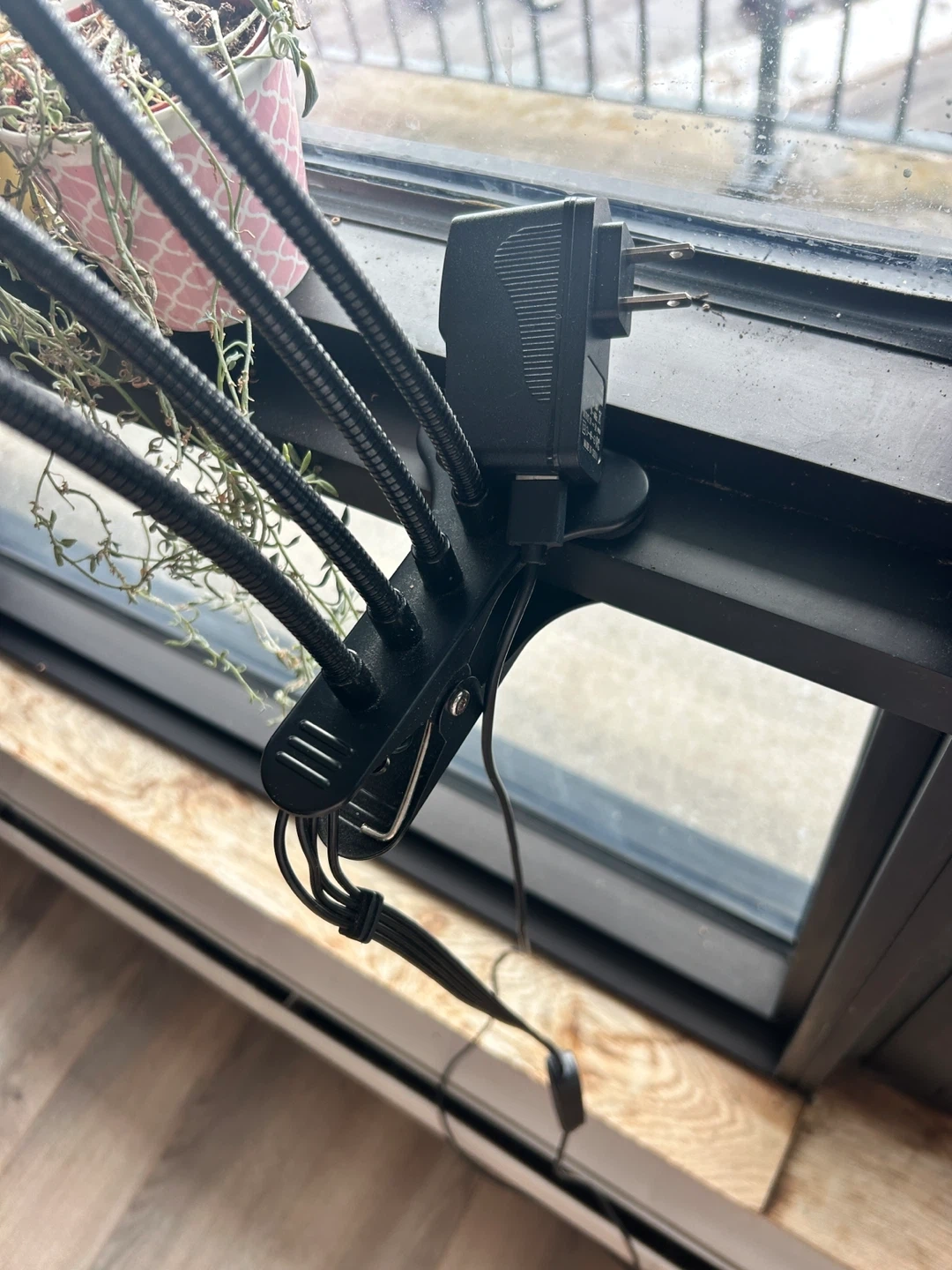 This 4-head LED grow light provides adjustable full-spectrum lighting for plants. It features multiple brightness levels and timing options for customized plant care. Flexible goosenecks allow for precise light placement. It's great for seedlings, houseplants, and indoor gardening.