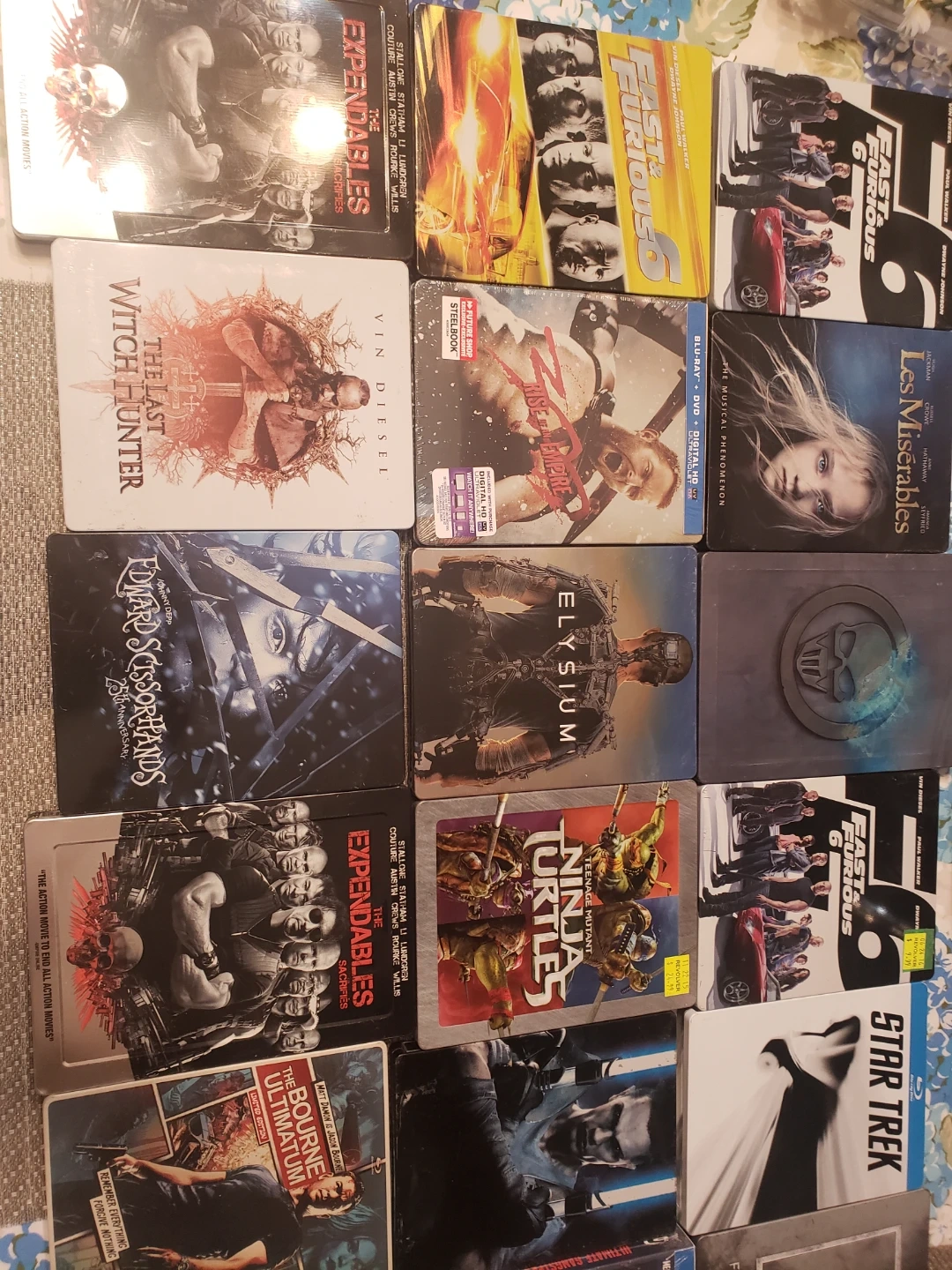 This is a collection of various Blu-ray movies in Steelbook cases. Includes titles like The Bourne Ultimatum, Fast Five, Star Trek, and more. Great for movie collectors!