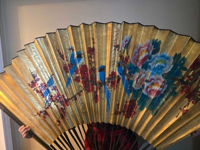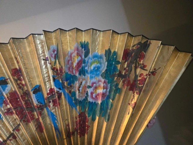 Beautiful large Asian wall art fan with a shiny gold background, featuring pretty blue birds and colorful flowers. A great piece for wall decor that adds a nice touch to any room. Measures 60x40. Pick up in Welland. $125 or best offer. If the ad is still up, it's still available!
