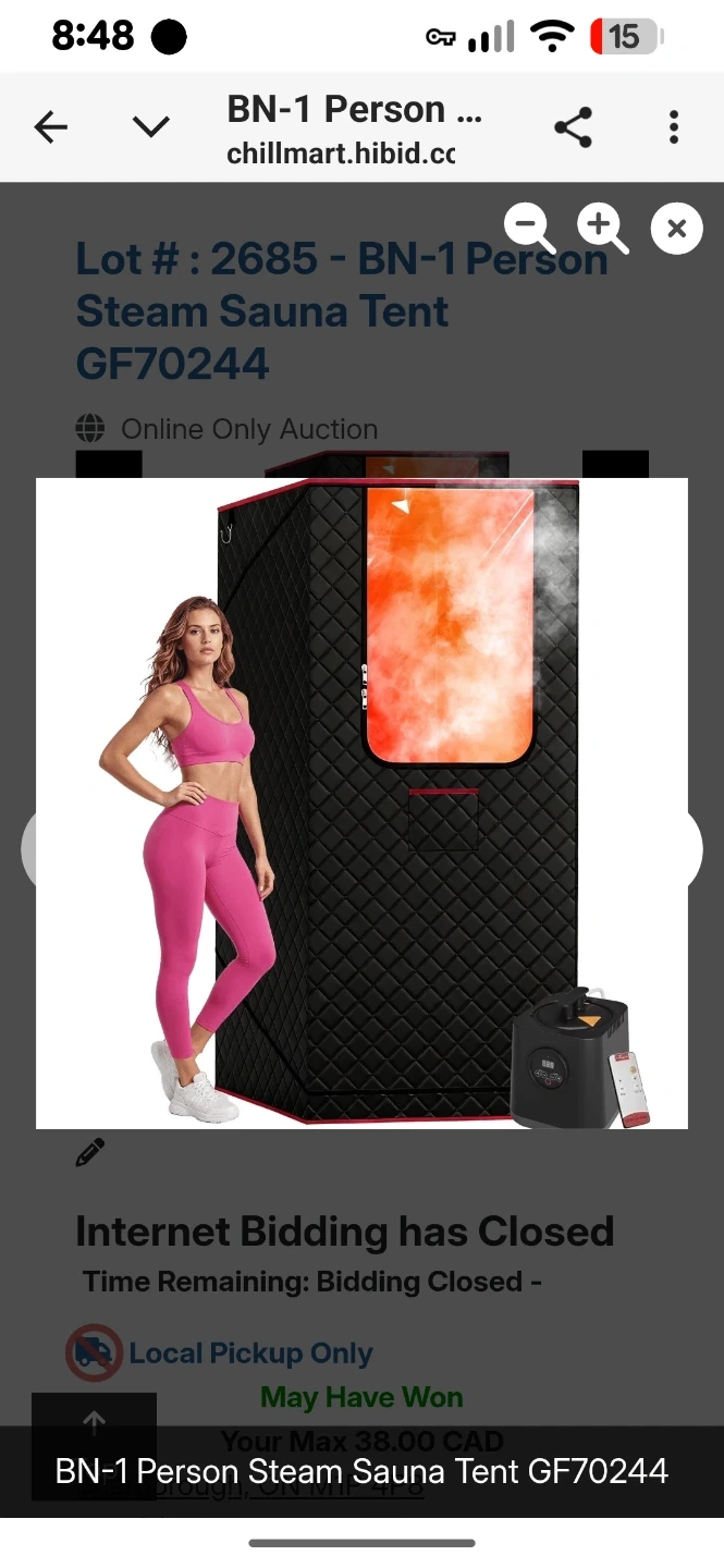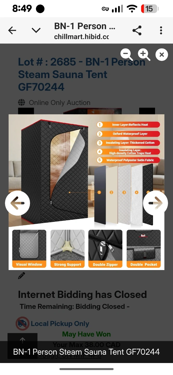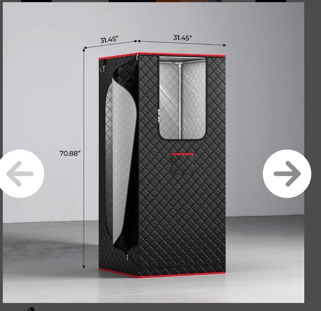 This is a 1 person steam sauna tent with a 31.45"x31.45"x70.88" dimension. It's constructed with multiple layers including Oxford Waterproof Layer, Thickened Cotton, and Waterproof Polyester Satin Fabric. It features a visual window, strong support, and a double zipper for easy access.
