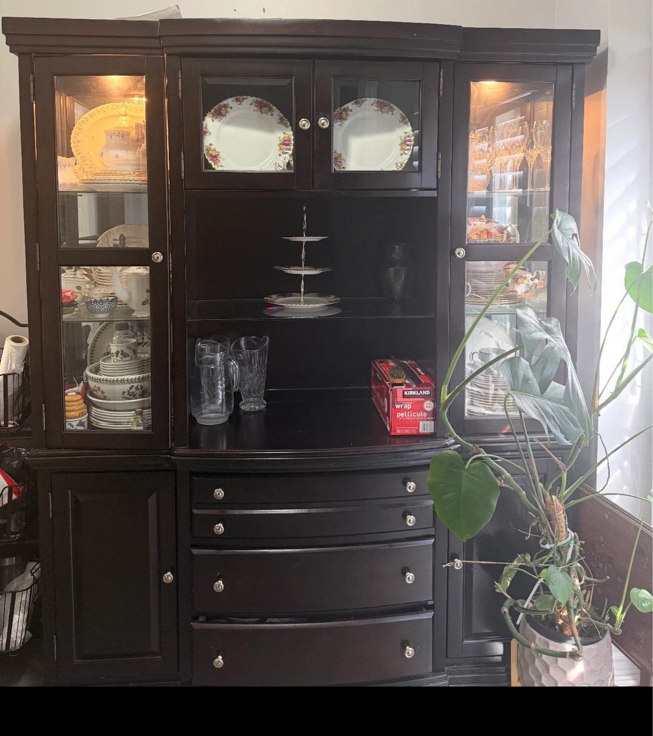 A spacious china cabinet in a dark brown finish. It features glass doors on the upper section for displaying dishes and glassware. The lower section has drawers for storage. Includes some decorative plates and glassware.