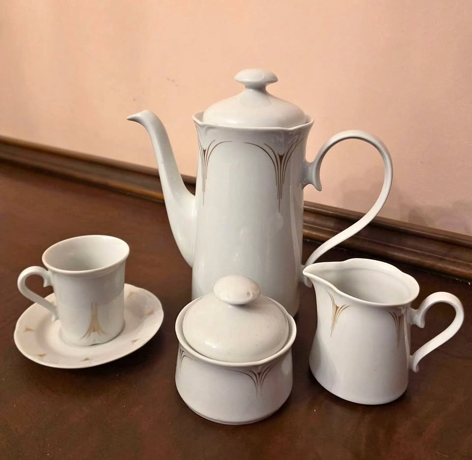 Beautiful vintage porcelain coffee/tea set. Includes: Coffee pot with lid, Creamer, Sugar bowl with lid, 12 cups, 12 matching saucers. Classic white design with subtle gold accents. Elegant and timeless — perfect for entertaining, display cabinet, or collectors. Gently used and in good condition. No visible cracks. Pickup only.