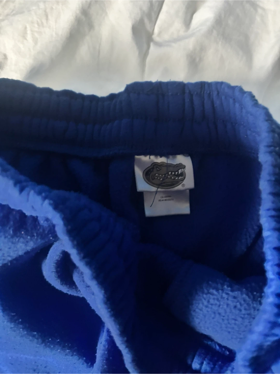 Royal blue sweatpants with the Florida Gators logo and 'Florida' text graphic. Comfortable fleece material. Elastic waistband and cuffs.