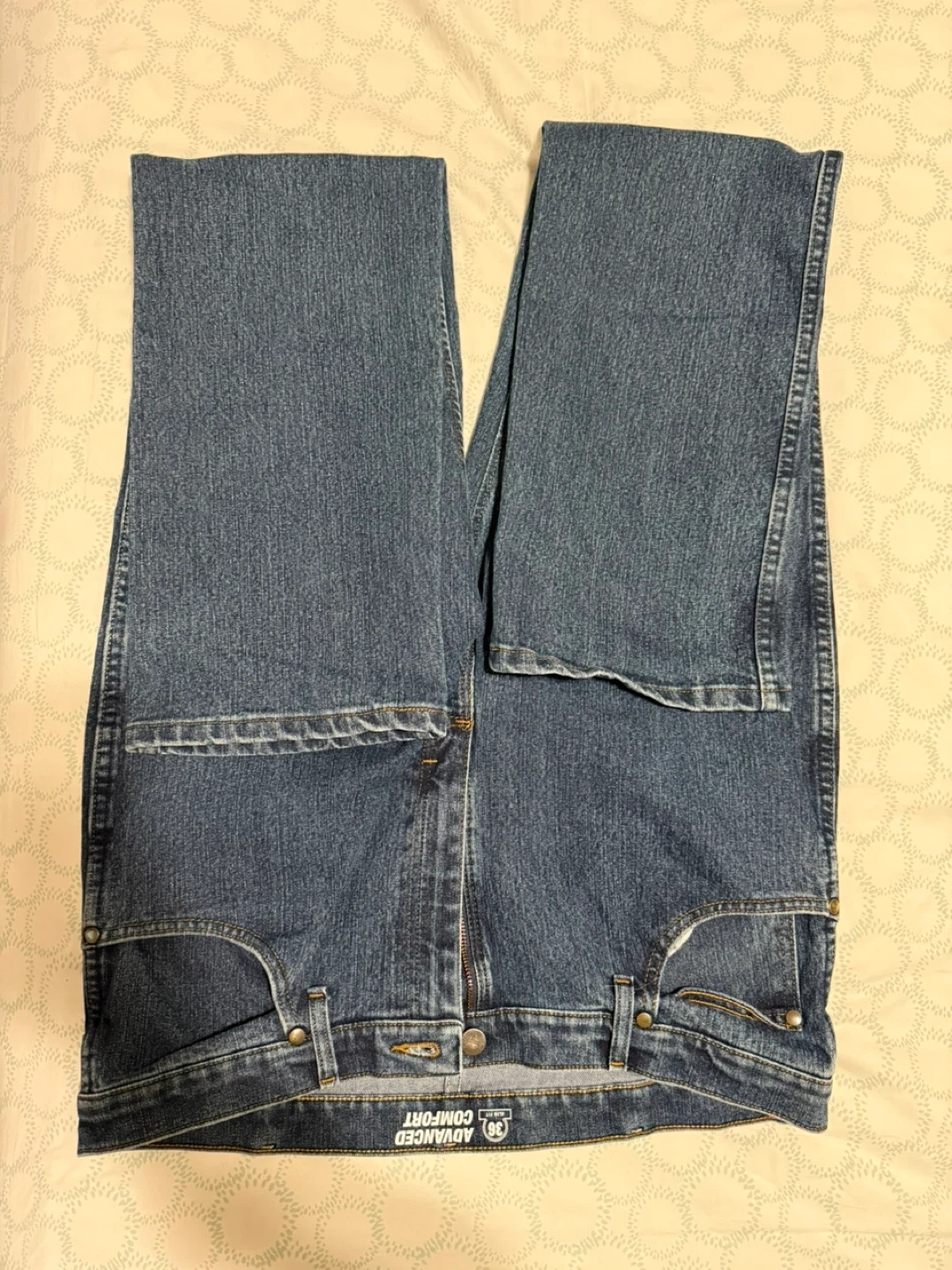 Selling a pair of Wrangler Advanced Comfort jeans in size 38x34. They are made of 79% cotton, 20% polyester, and 1% spandex. Comfortable and durable!