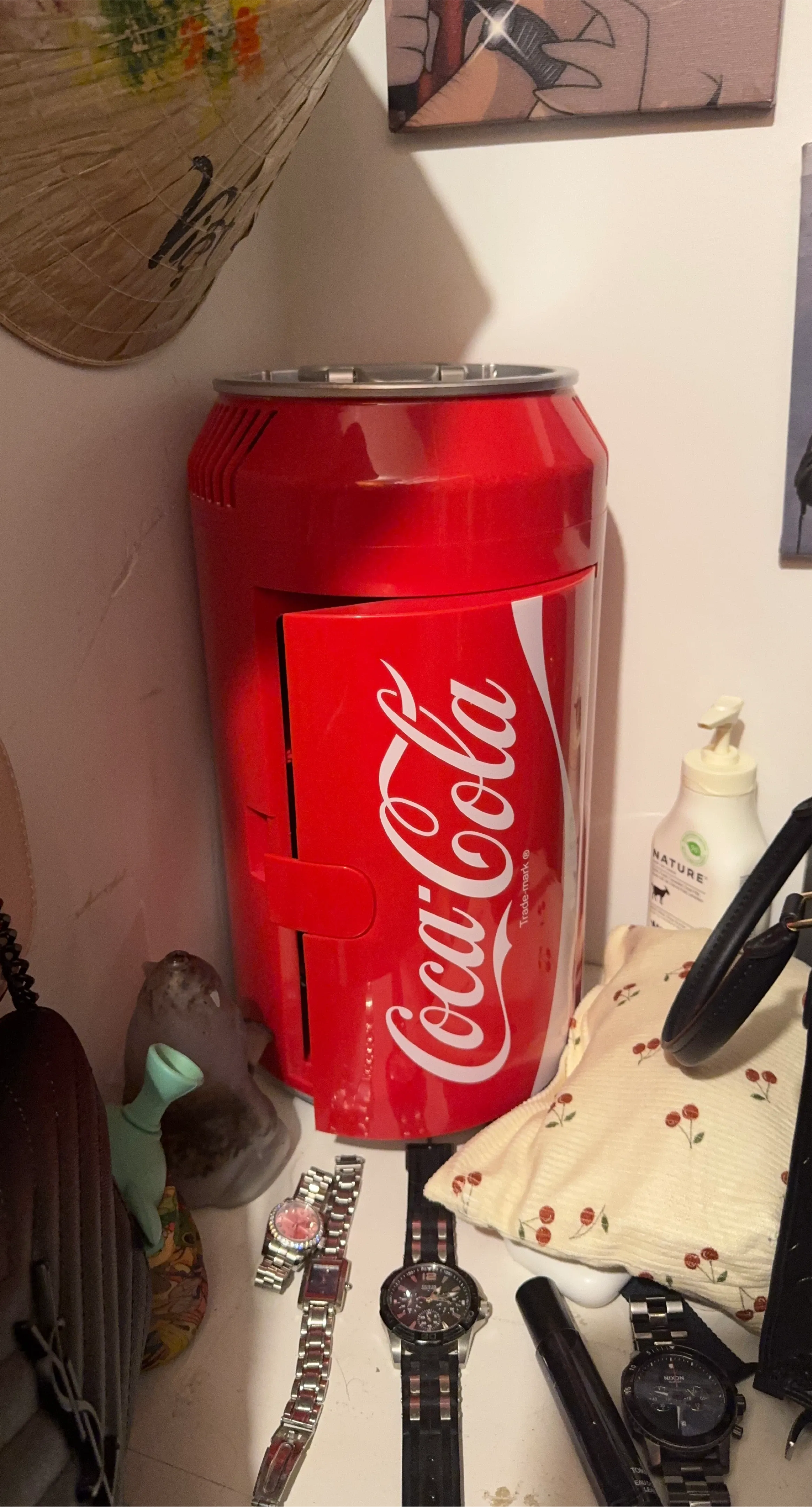This is a Coca-Cola themed mini fridge shaped like a classic can. It's perfect for keeping drinks cool in a dorm room or office. The compact size makes it easy to place almost anywhere!