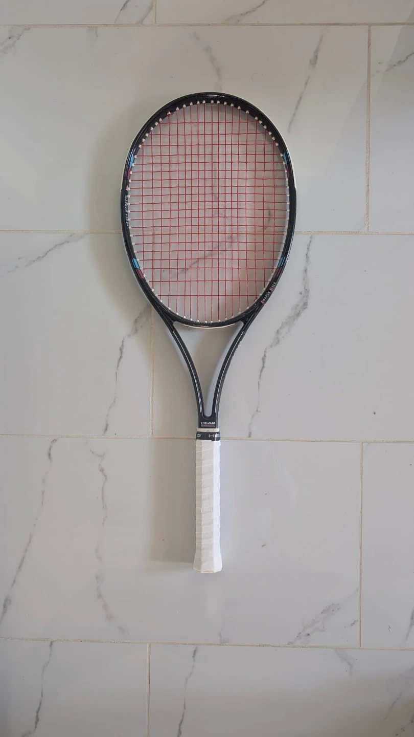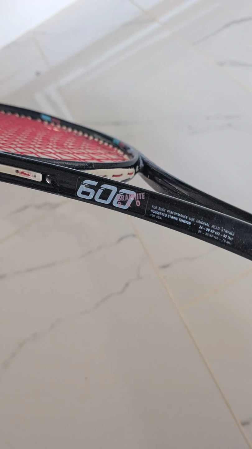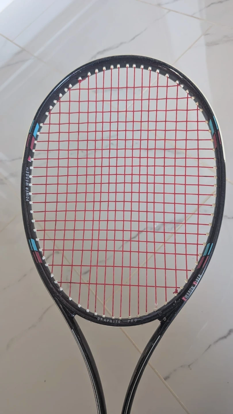 This is a HEAD Graphite Pro tennis racquet with a grip size of L3 (4 3/8). It has red strings and a black frame. Suggested string tension is 24-28 KP (53-62 lbs).