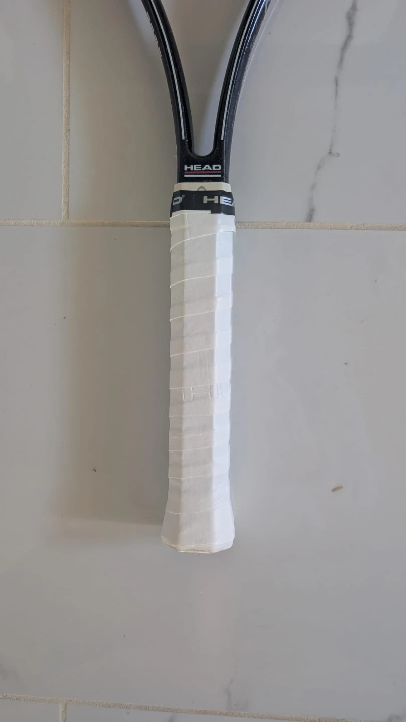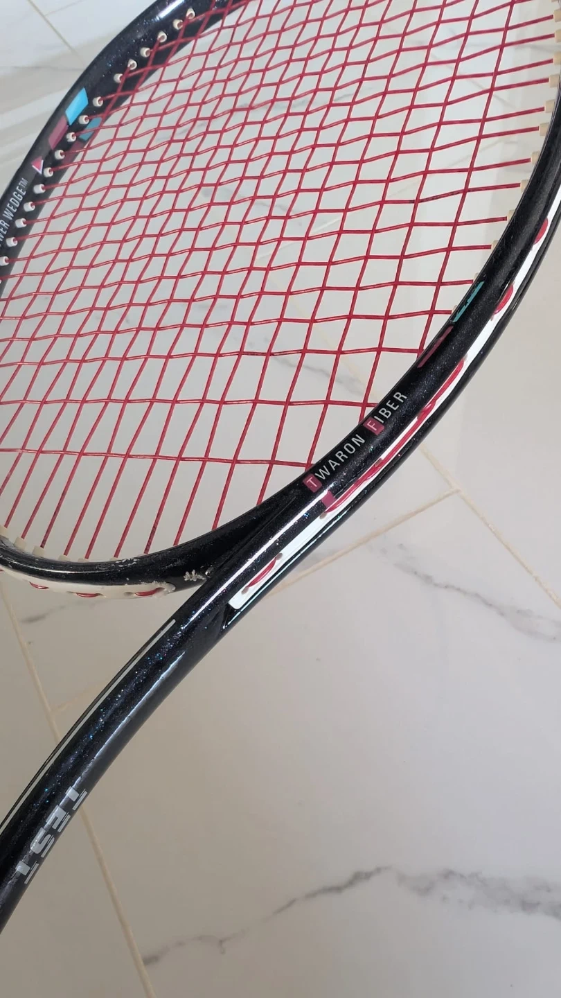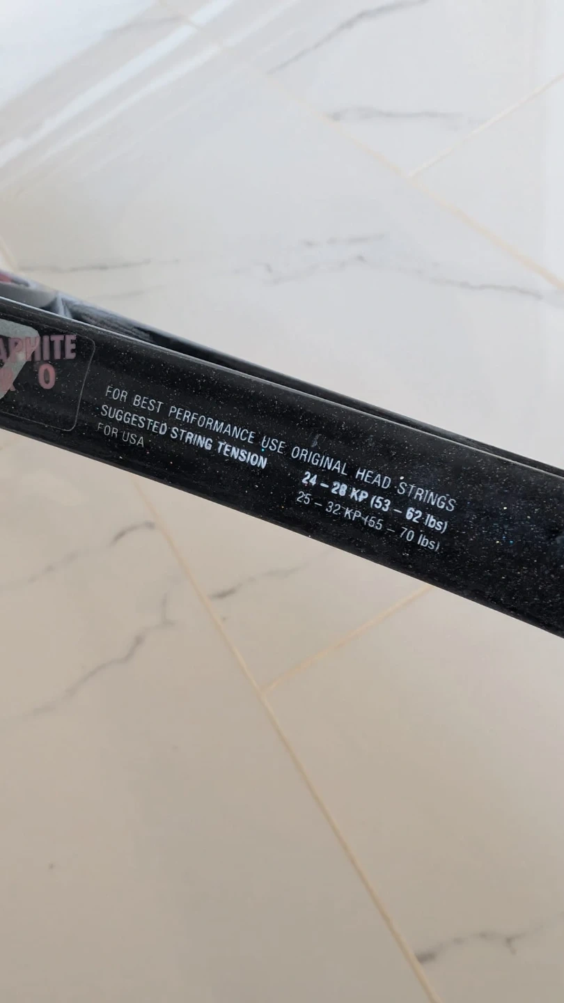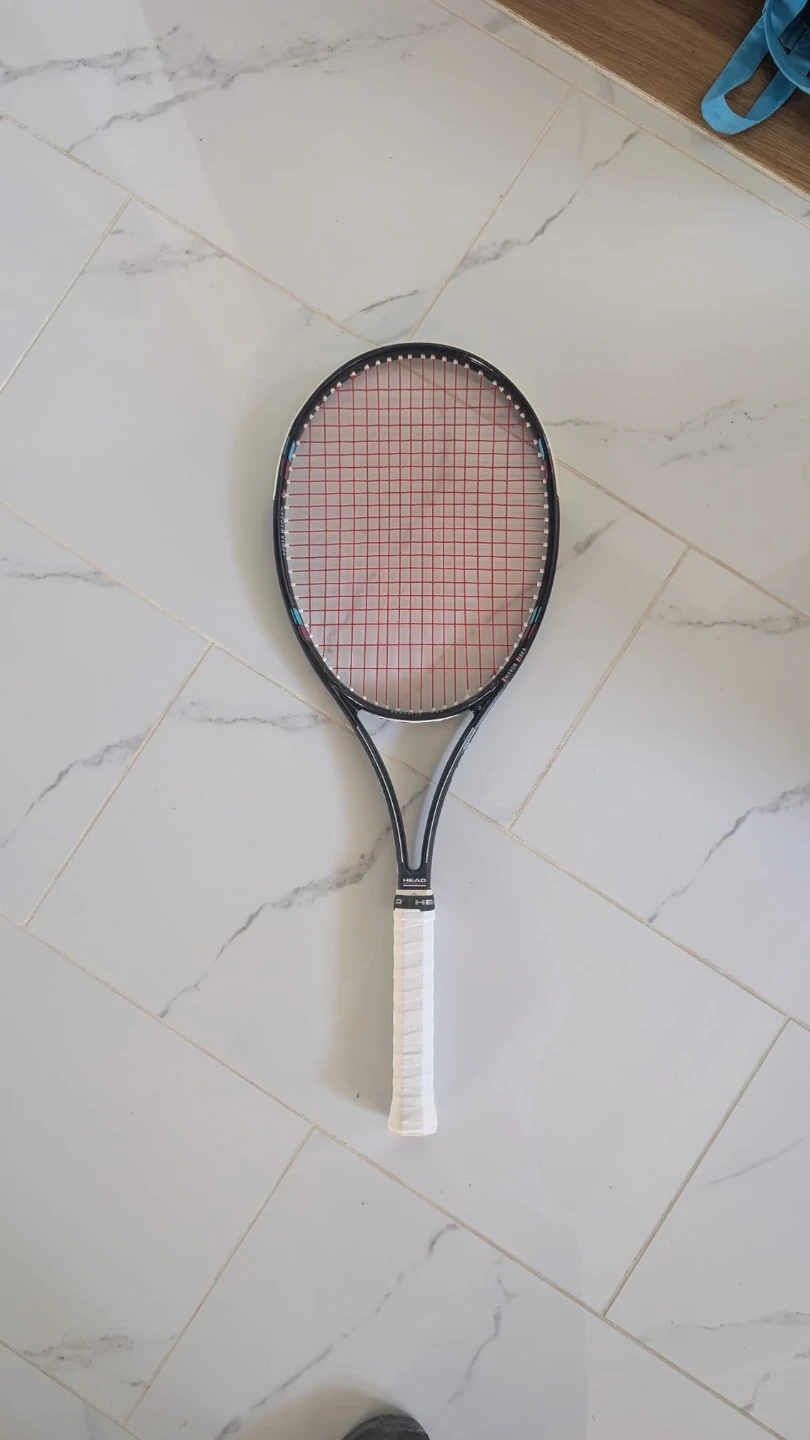 This is a HEAD Graphite Pro tennis racquet with a grip size of L3 (4 3/8). It has red strings and a black frame. Suggested string tension is 24-28 KP (53-62 lbs).