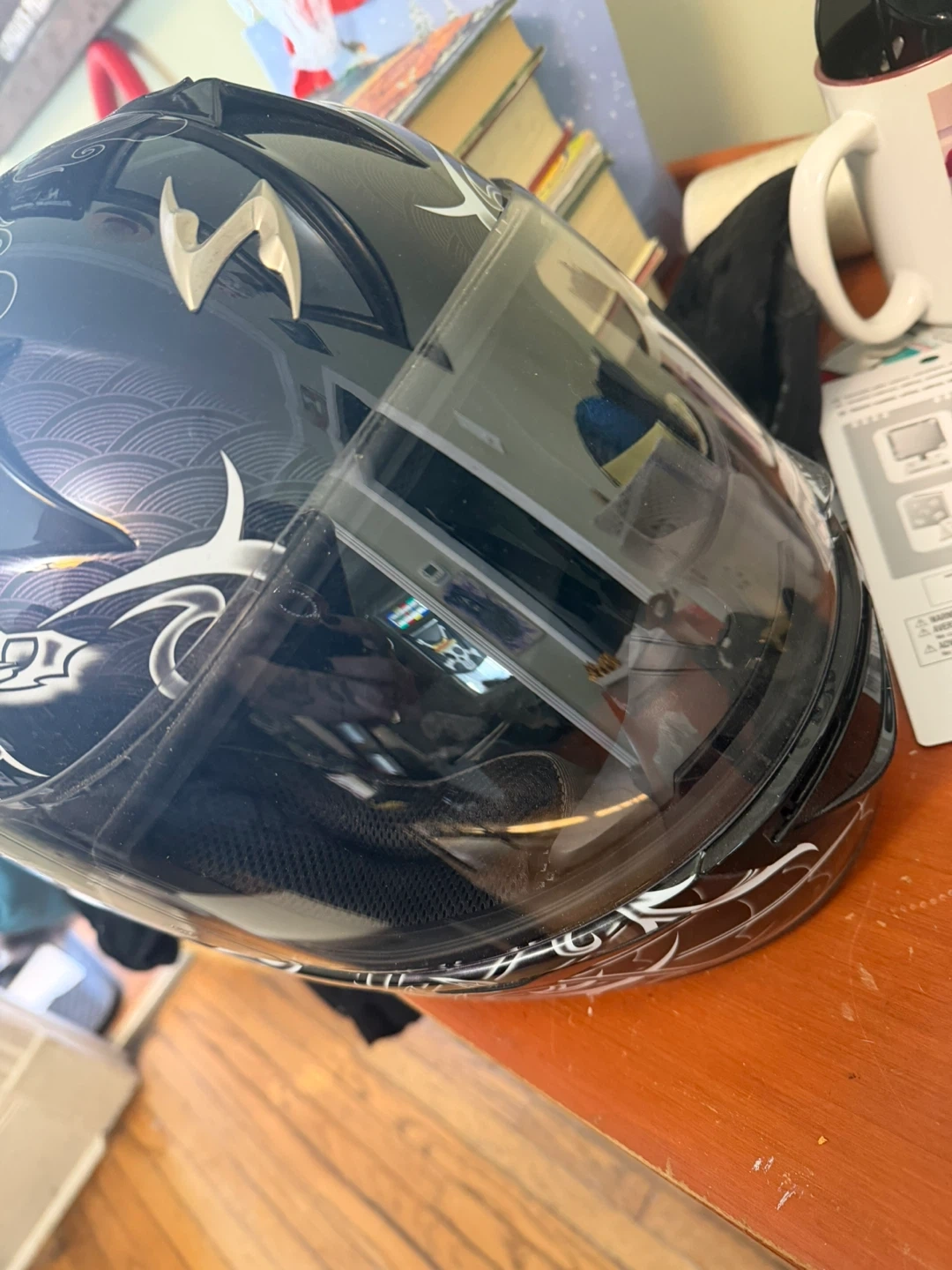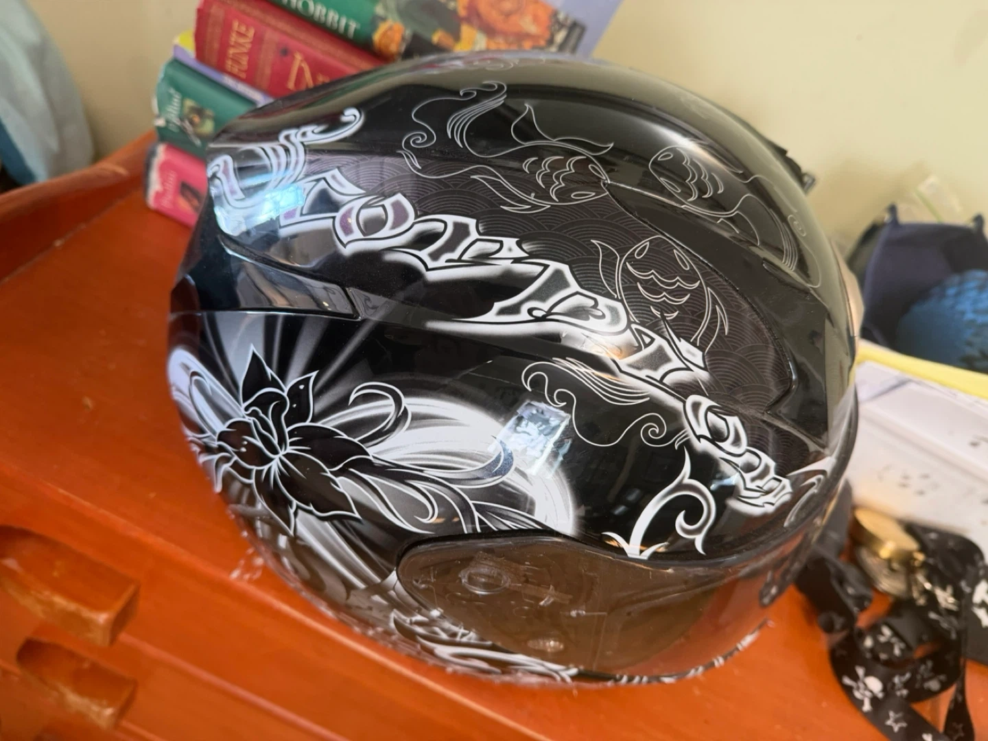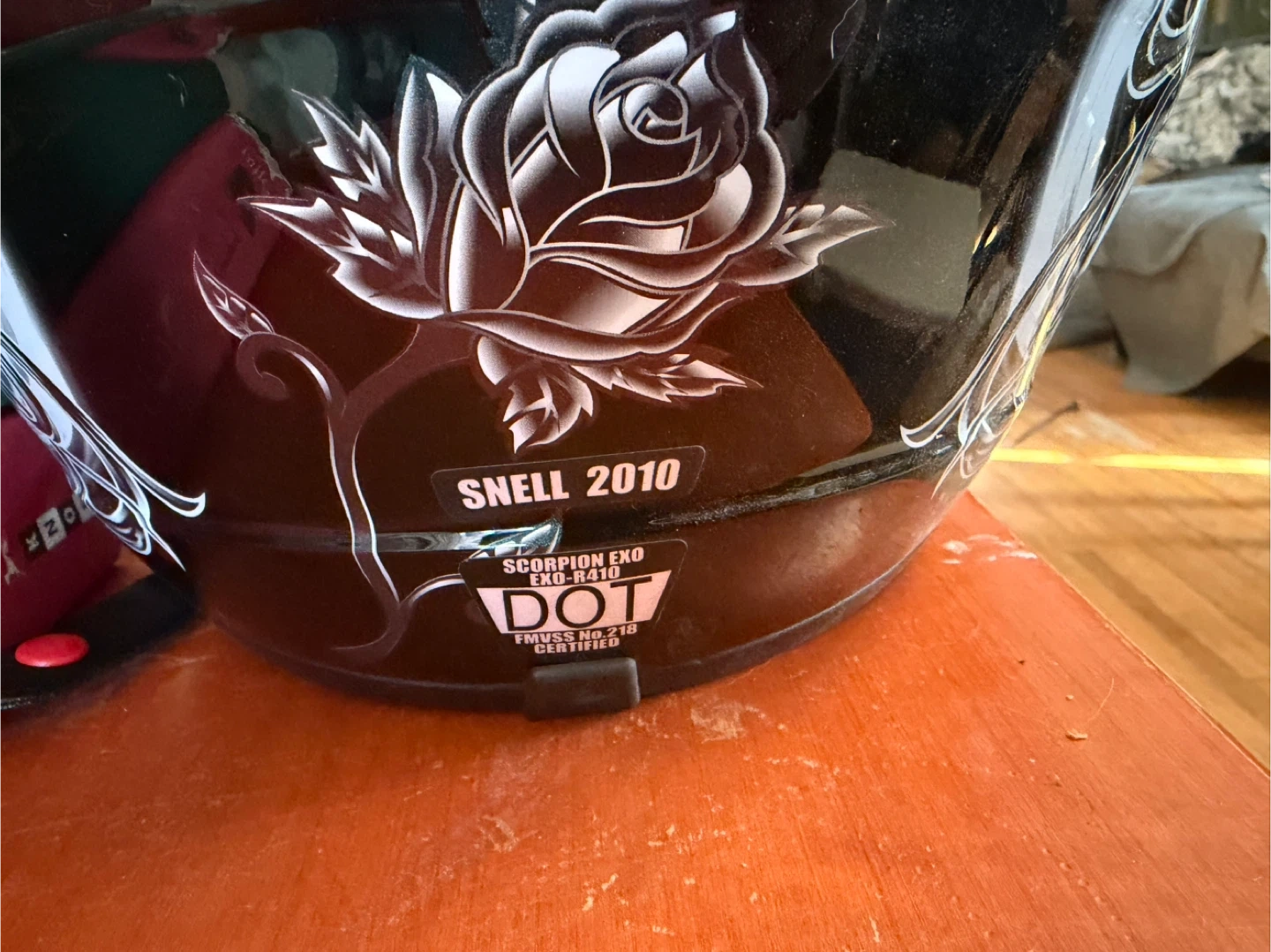 This Scorpion EXO-R410 helmet features a black shell with a white and grey floral design. It meets Snell 2010 and DOT standards. It's a full-face helmet for riders. Size small 55-56cm.