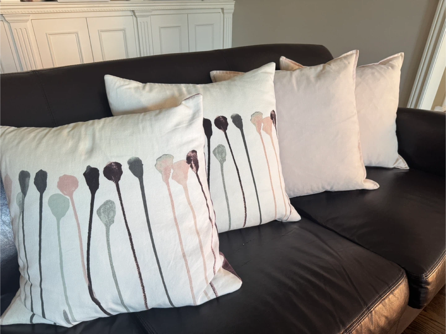 IKEA Four decorative throw pillows in various designs. Two pillows feature a floral stem pattern in neutral tones, and two are solid cream-coloured. They're perfect for adding a touch of comfort and style to your living room or bedroom.