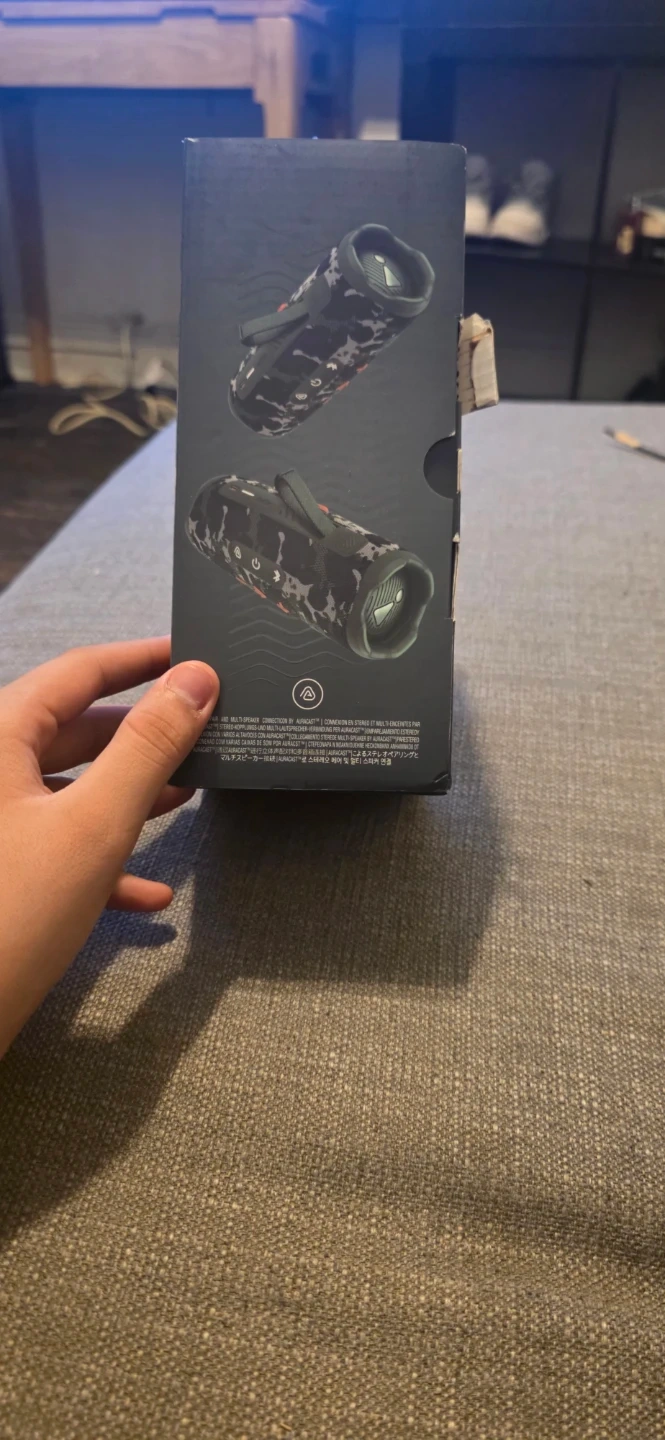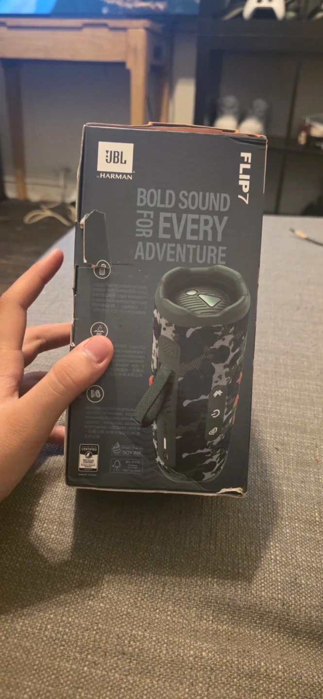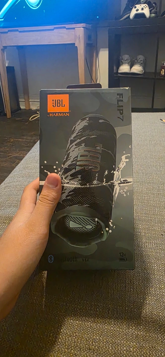 JBL Flip 7 portable speaker in a cool camouflage design. It's water-resistant and offers bold sound for any adventure. Bluetooth connectivity.
