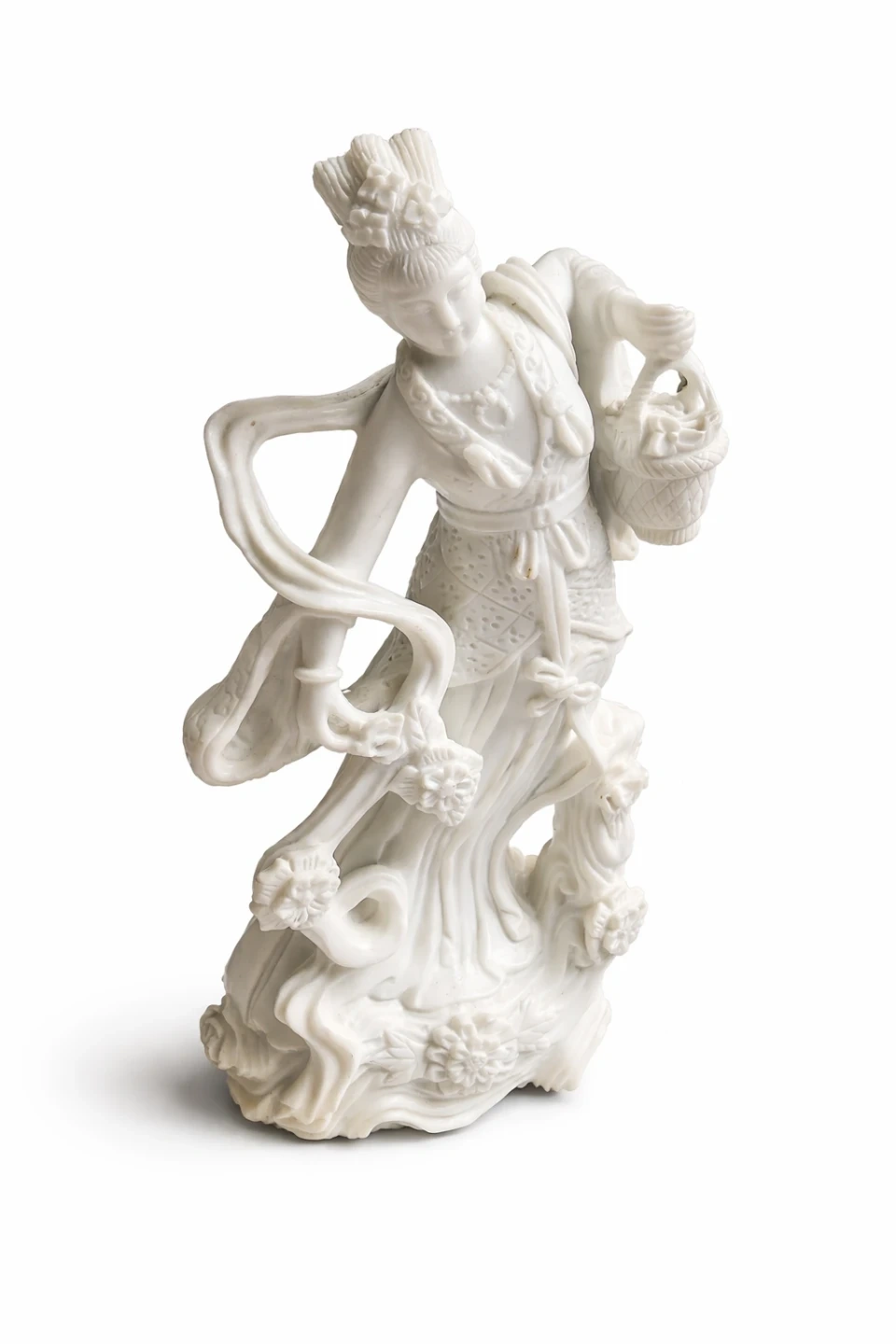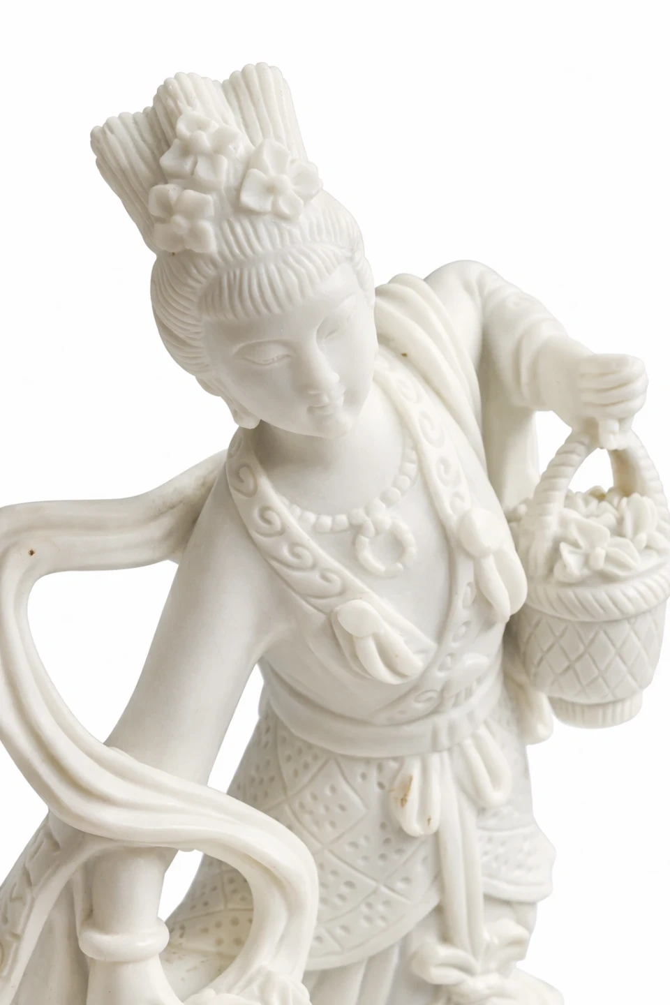 The carving has lovely detail in the robe, basket, flowers, and hair. A great accent piece for a console table, shelf, cabinet, or traditional décor setting.