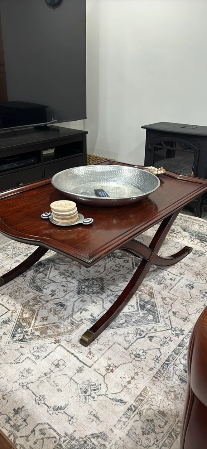This elegant tray table features a rich mahogany finish and a classic X-base design. Its surface is smooth and showcases the natural wood grain. Perfect for serving drinks or displaying decor.