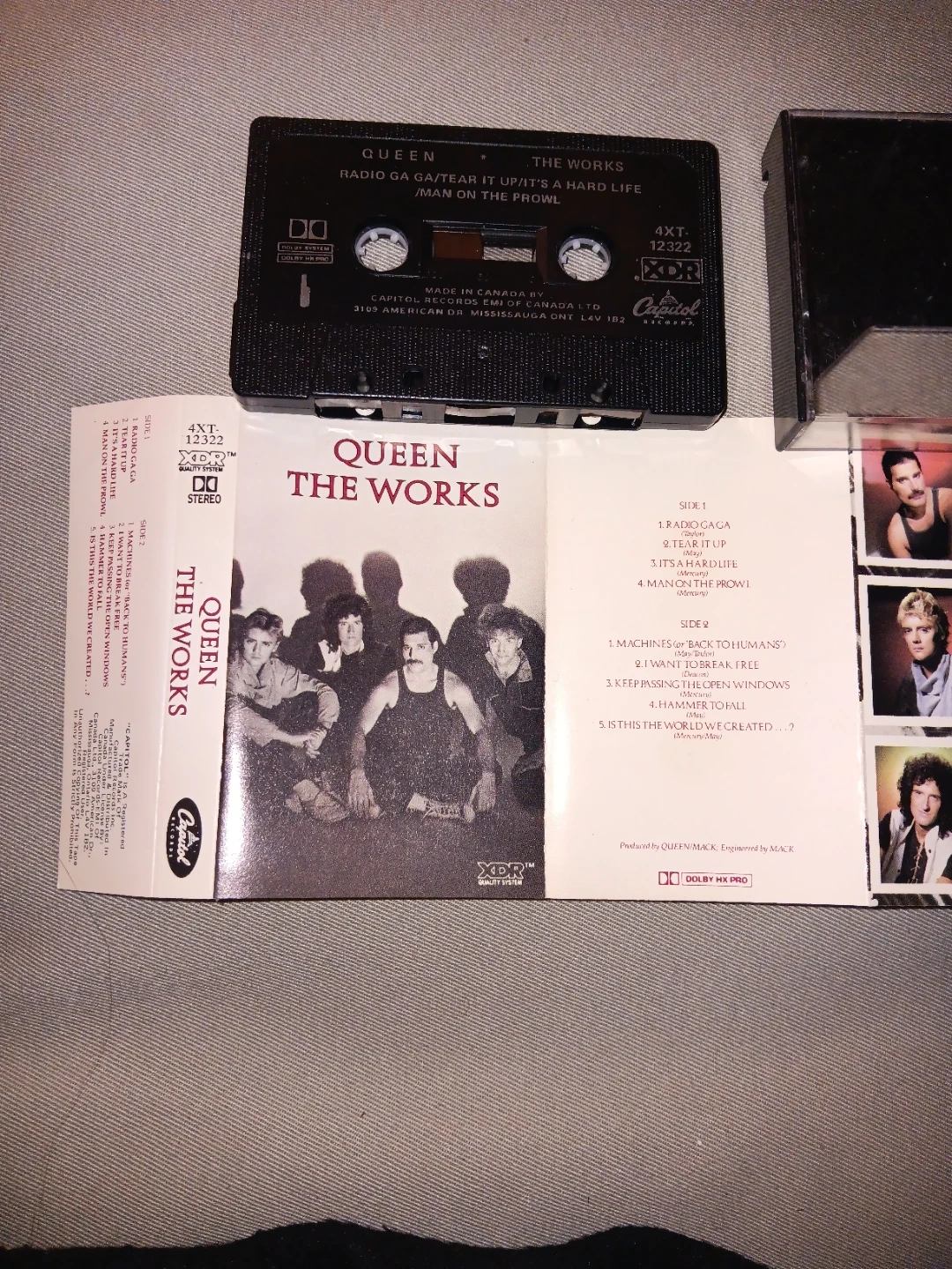 Queen's The Works cassette tape. Features songs like 'Radio Ga Ga', 'I Want to Break Free', and 'Hammer to Fall'. Includes original J-card.