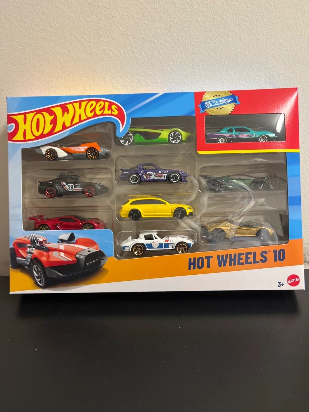 This is a new Hot Wheels 10 car pack. It includes a variety of colourful toy cars. These cars are recommended for ages 3 and up.
