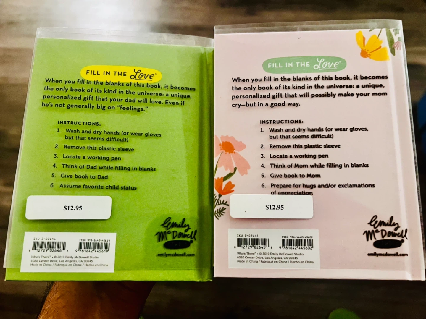 Two "Fill In The Love" books, one for Dad and one for Mom. Each book is a unique, personalized gift. Instructions include washing hands and thinking of moments to fill in the blanks. Prepare for hugs and exclamations of appreciation!