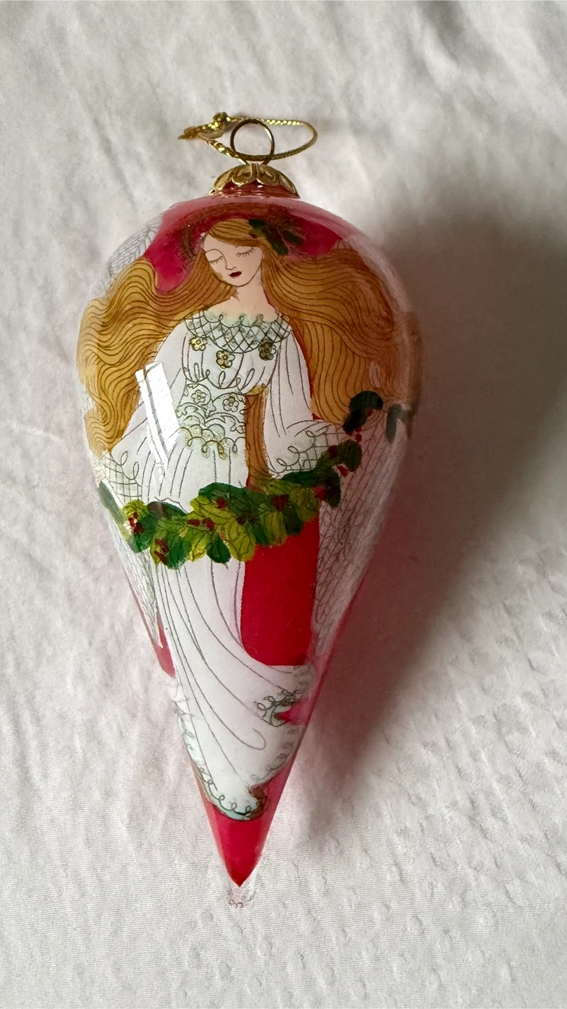 This is a beautiful tear drop shaped Christmas ornament. It features an angelic figure with long blonde hair and a wreath. The ornament is primarily red with some white and pink accents. It has a gold coloured cap with a hanging loop. This ornament would add a lovely touch to any holiday tree!