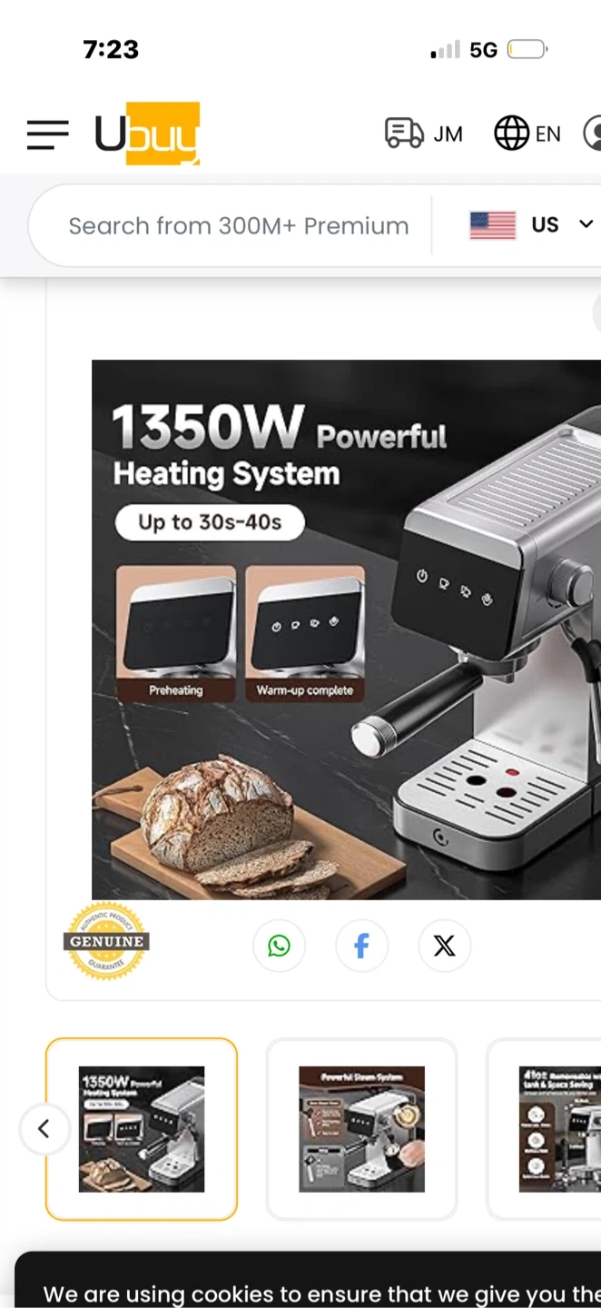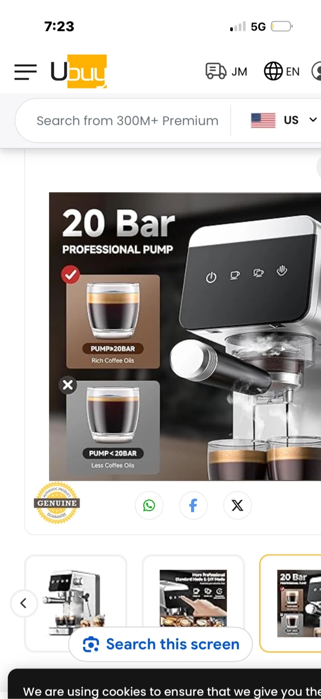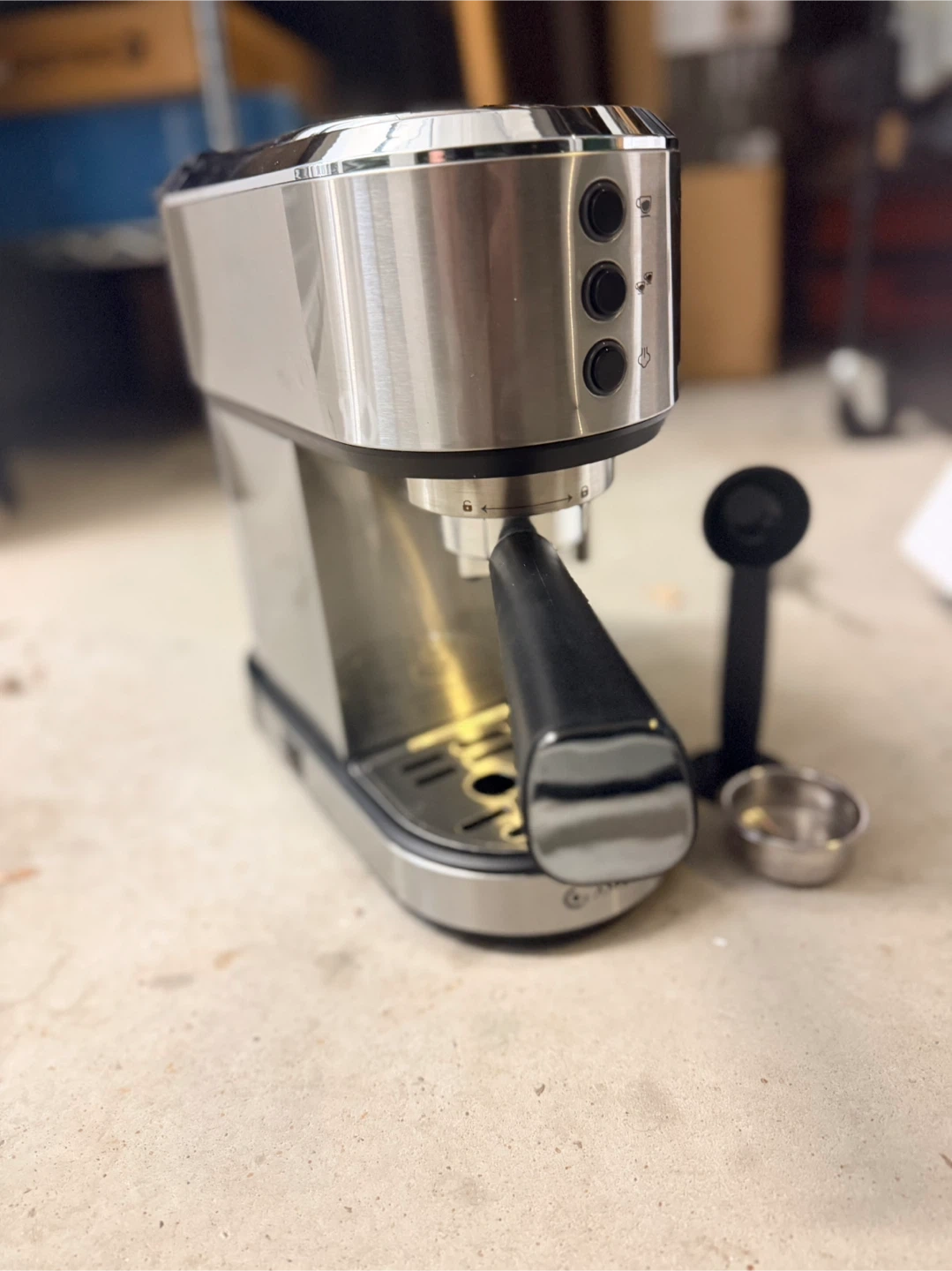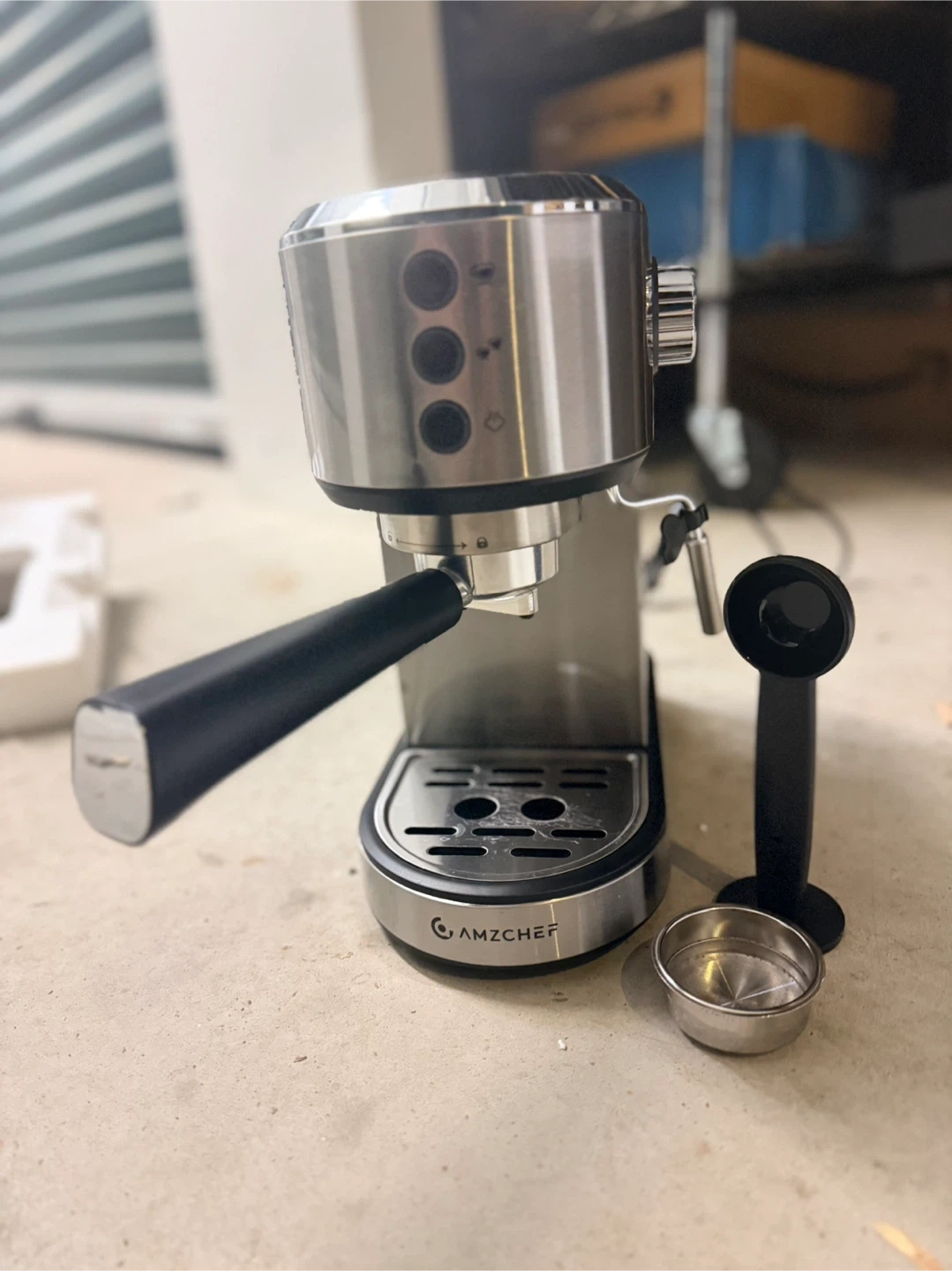 AMZCHEF 1350W espresso machine for sale. It features a powerful 20 Bar professional pump for rich coffee oils. Stainless steel construction with a black handle. Comes with a portafilter and a measuring scoop.
